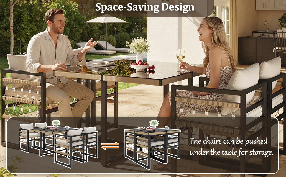 The covers of the cushions and seat pads are removable and washable, and the splash-proof fabric protects against stains. The seat stools feature height-adjustable feet for uneven ground. The 4 individual armchairs can be stored space-savingly under the table to maintain order. The table, made of easy-care safety glass, is robust for permanent outdoor use.