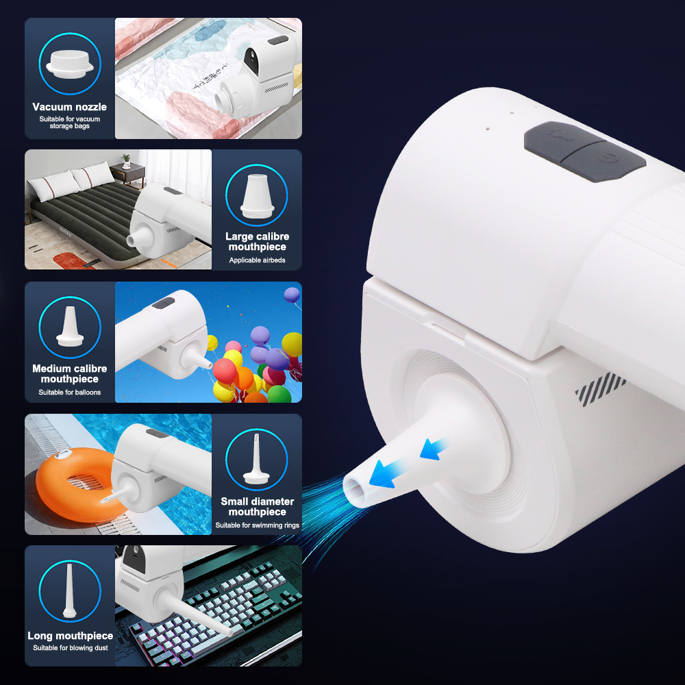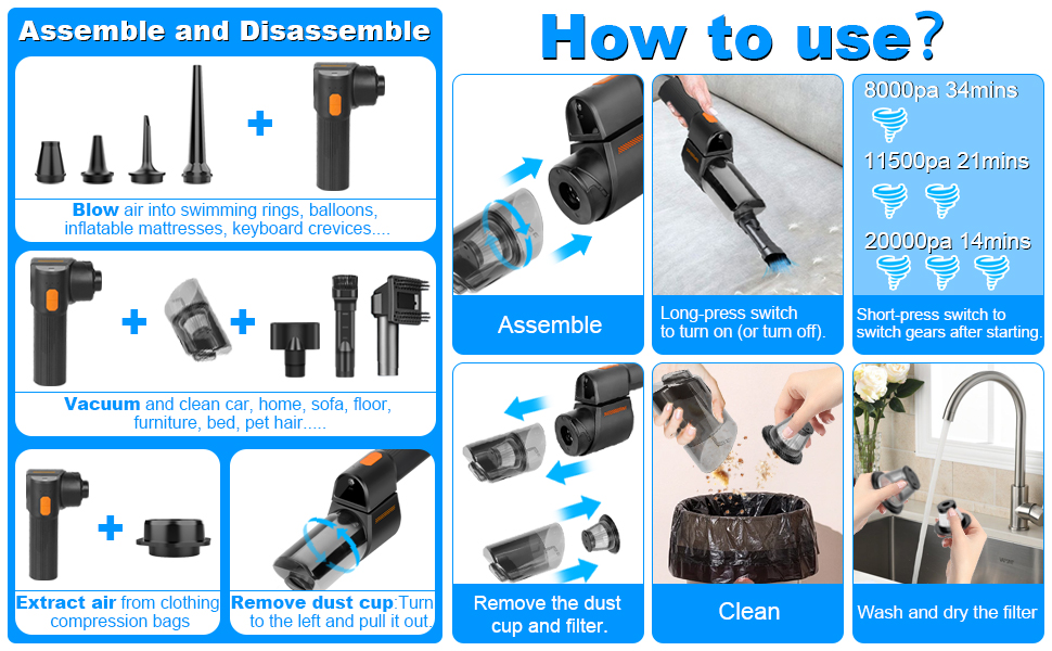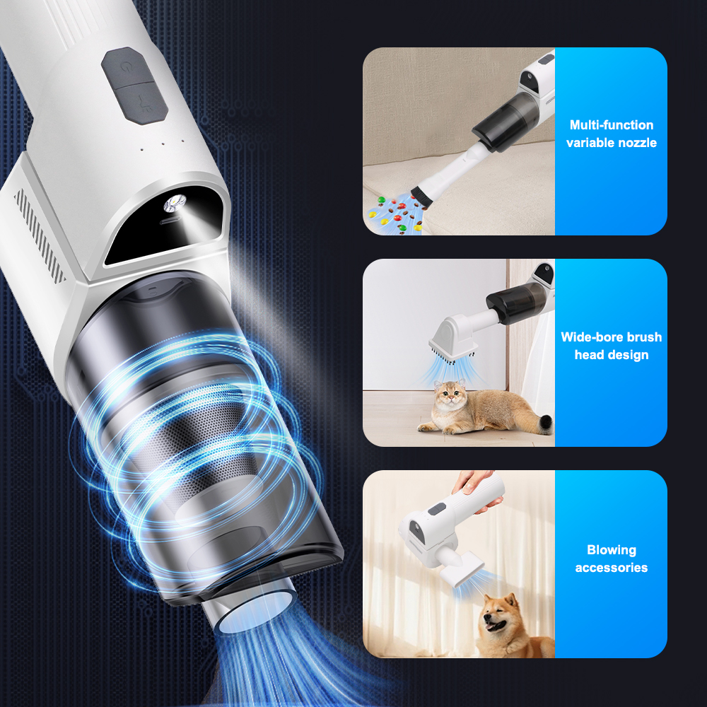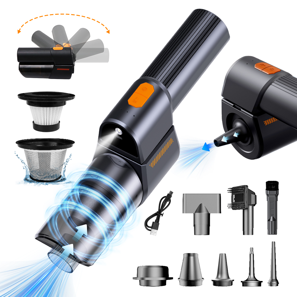 18000PA High Power cordless car vacuum cleaner supports 4 modes: vacuum, blow, inflate, and pump, equipped with [2]brushes and [6]nozzles, which can be used for multi-scene cleaning to meet different cleaning needs. This handheld vacuum cleaner quickly and efficiently removes dust or debris from surfaces, as well as blowing away dust or sand from crevices and corners. It can be widely used in cars, pets, homes, offices, and kitchens.
