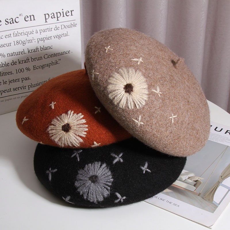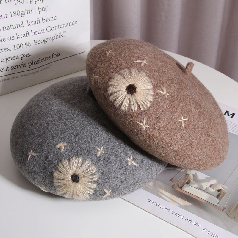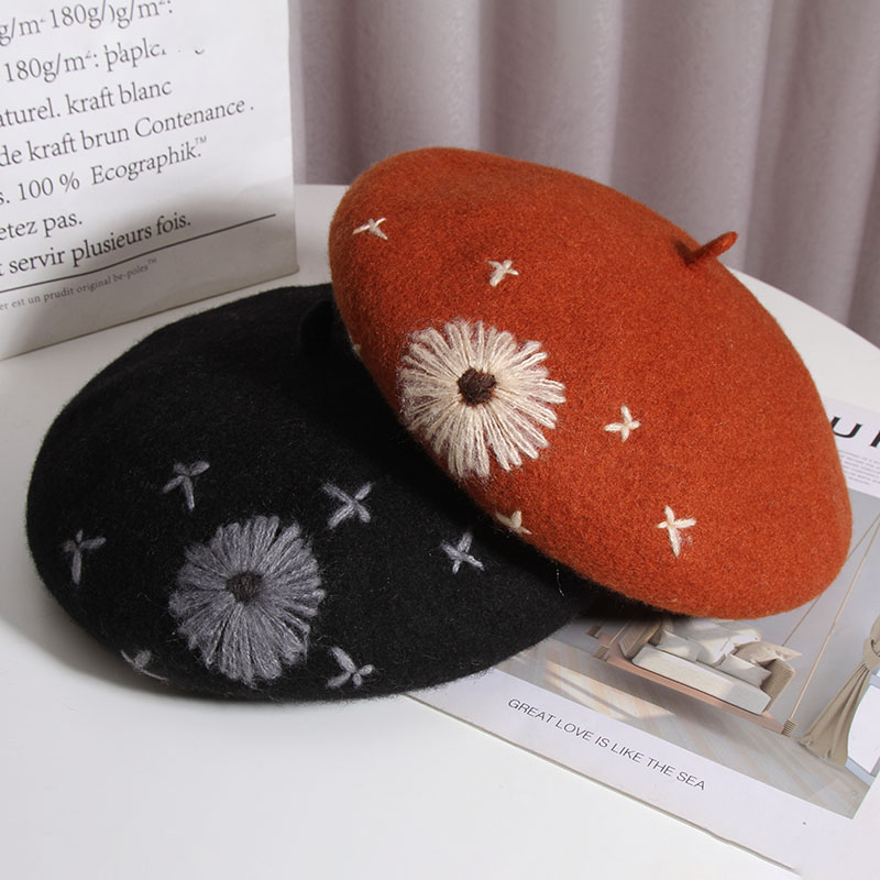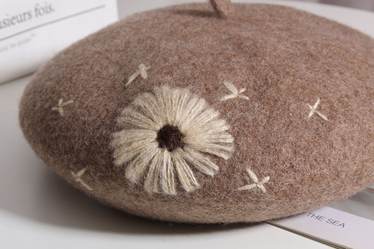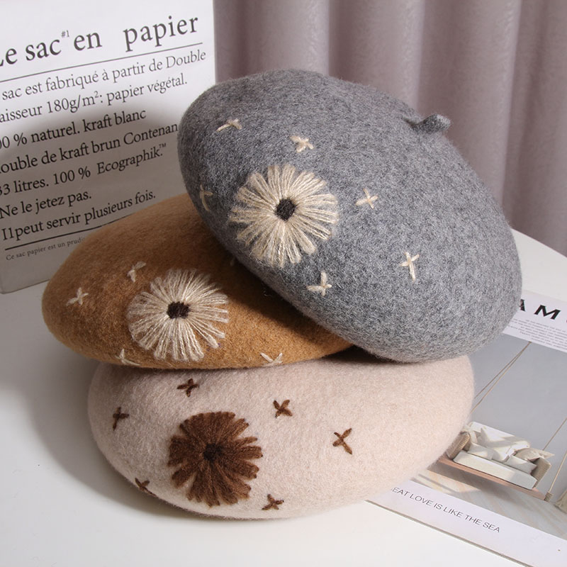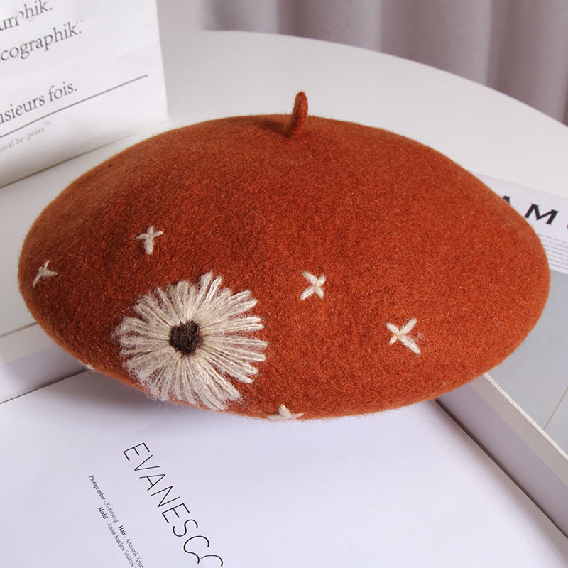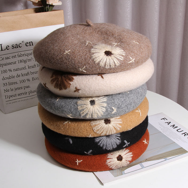 Color: A Daisy wool beret-Heather Gray, a daisy wool beret-beige, a daisy wool beret-Black, a daisy wool beret-rust red, one Daisy wool beret-camel, one Daisy wool beret-mocha color