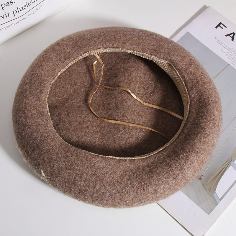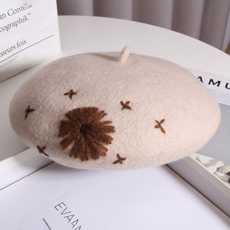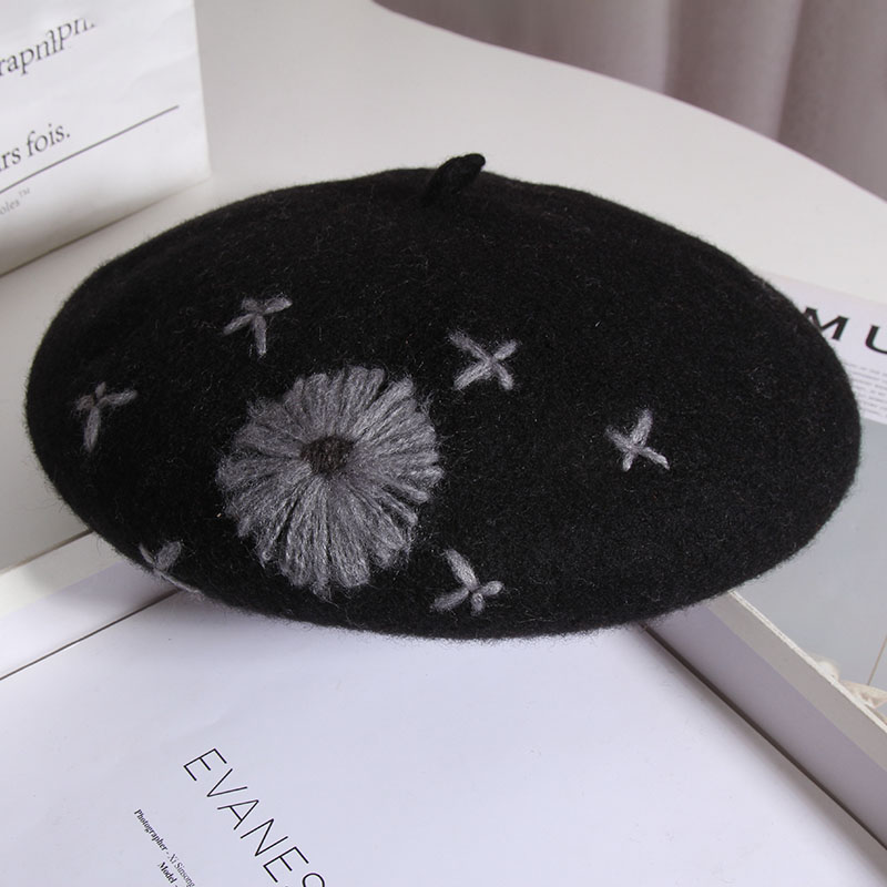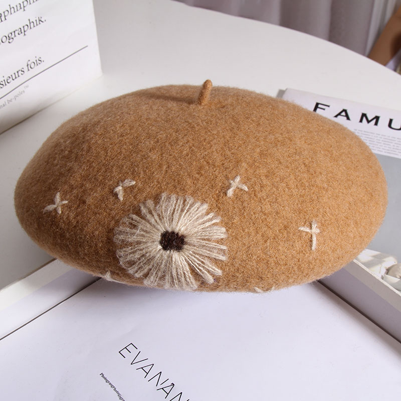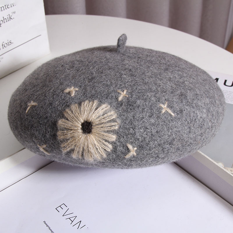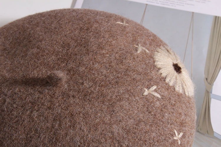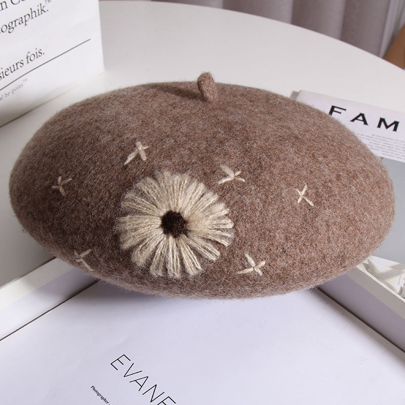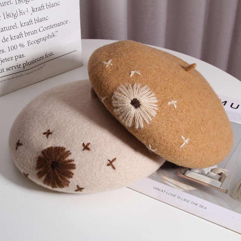 Color: A Daisy wool beret-Heather Gray, a daisy wool beret-beige, a daisy wool beret-Black, a daisy wool beret-rust red, one Daisy wool beret-camel, one Daisy wool beret-mocha color
