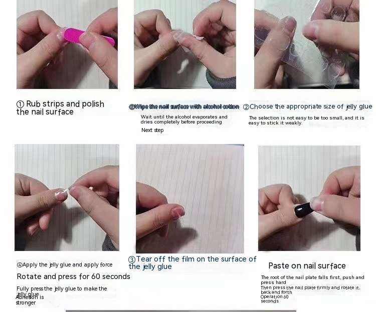 Nail clip * 10+Jelly glue * 1+Glue * 1+Alcohol cotton * 1+Nail file * 1+Small wooden stick * 1