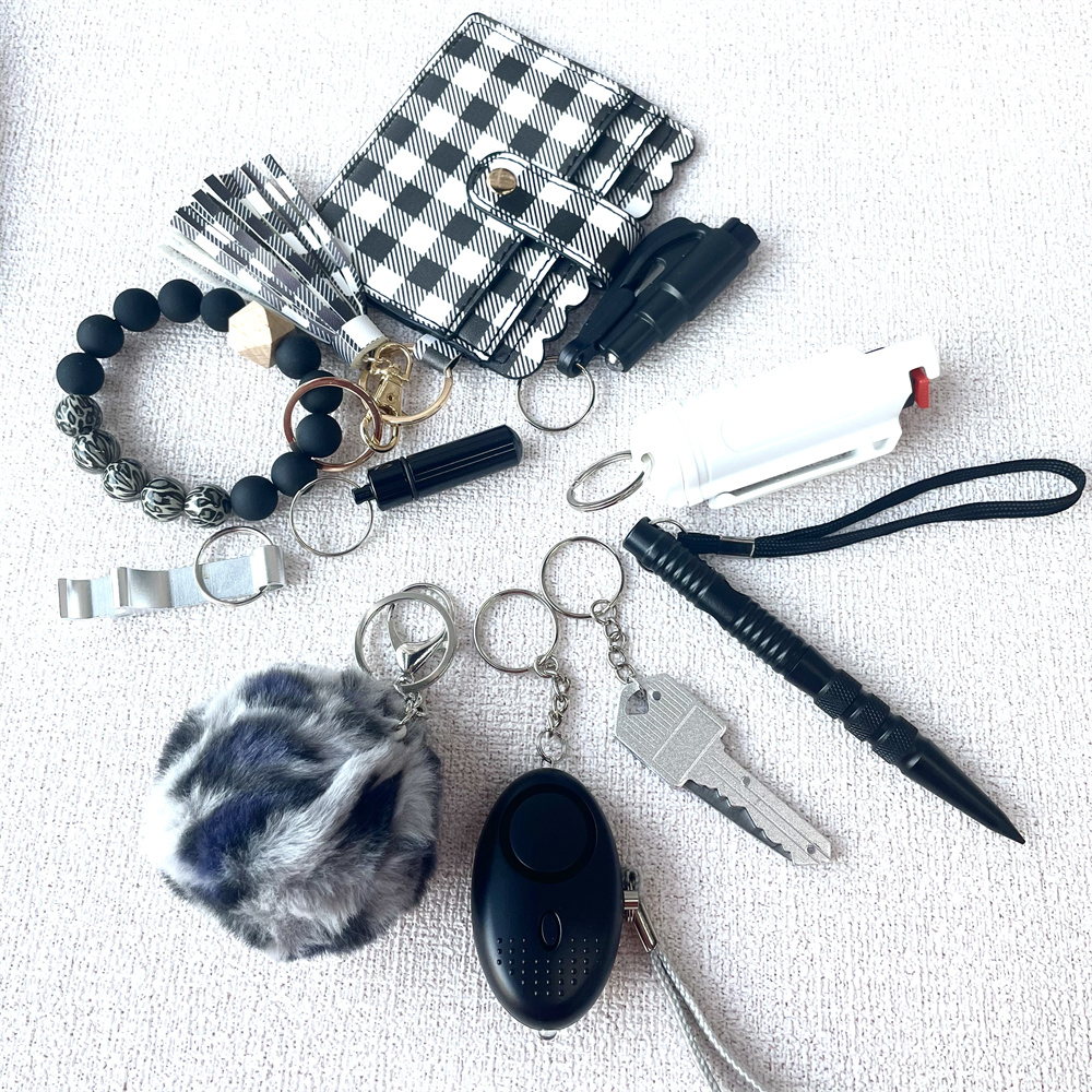 Packing:Alarm x1pcTactical pen x1pcWindow breaker x1pcBottle opener x1pcSpray box x1pcKey knife x1pcHair ball x1pcBracelet bag x1pc