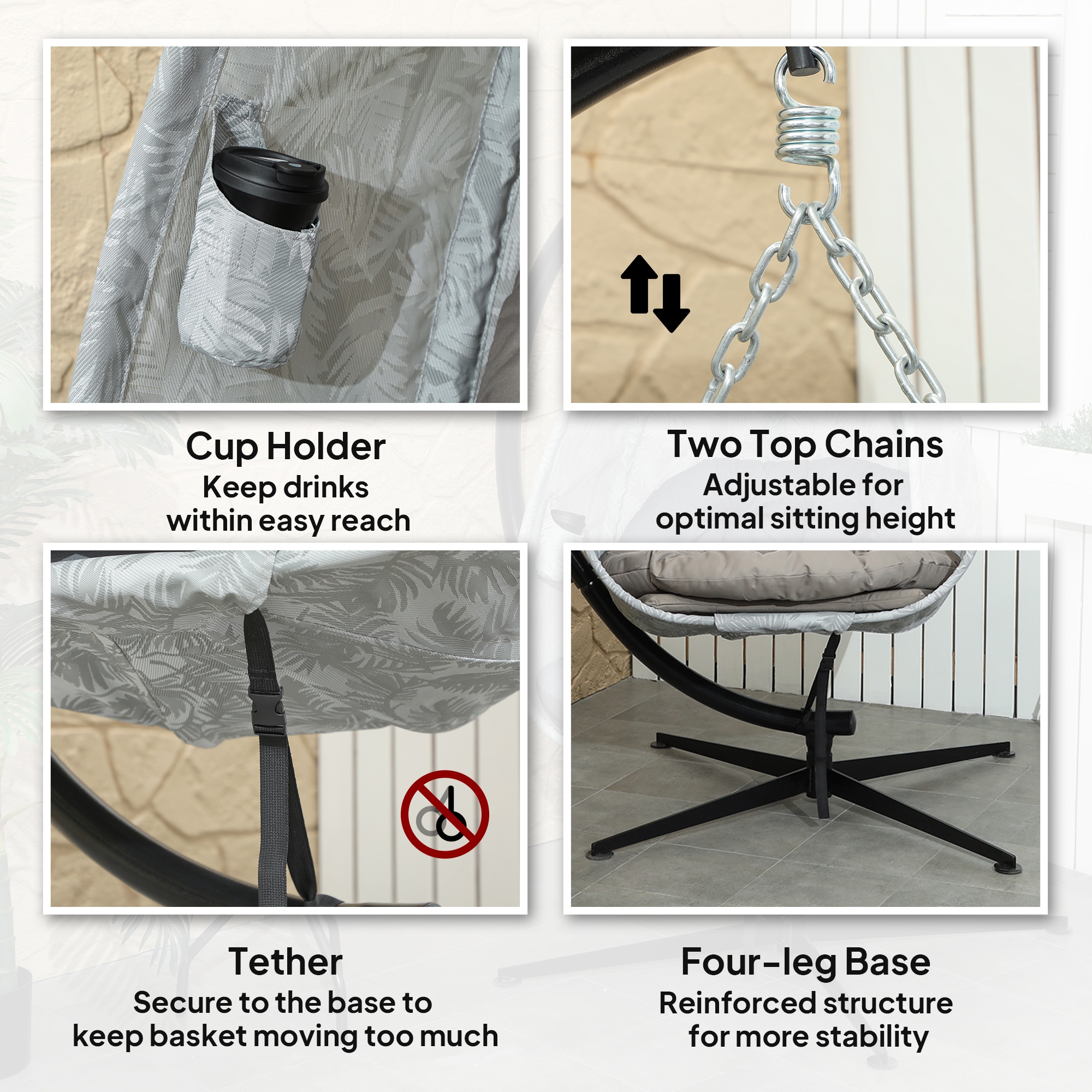 Relax in optimal comfort with this outdoor egg chair from ! With a wide seat covered in feathery leaves pattern texteline fabric, this egg garden chair offers cosy, bird-nest-like retreat. The folding basket allows easy storage, with a cup holder keeping your drink close. A large 13 cm thickened cushion and a bottom cushion offer cloud-like comfort. Powder-coated steel frame and X-shaped base mean a stable swinging egg chair. Adjustable top chains customise your swinging experience.
