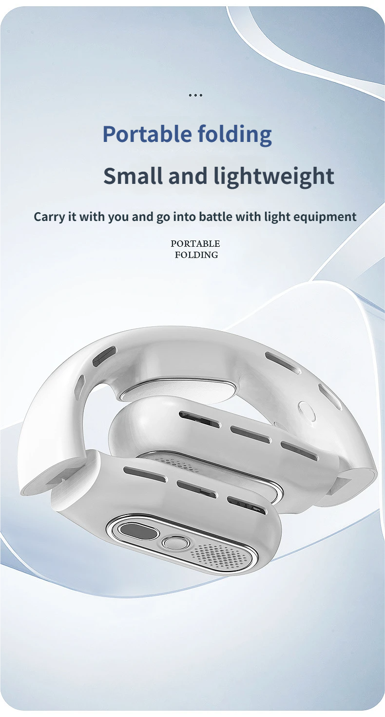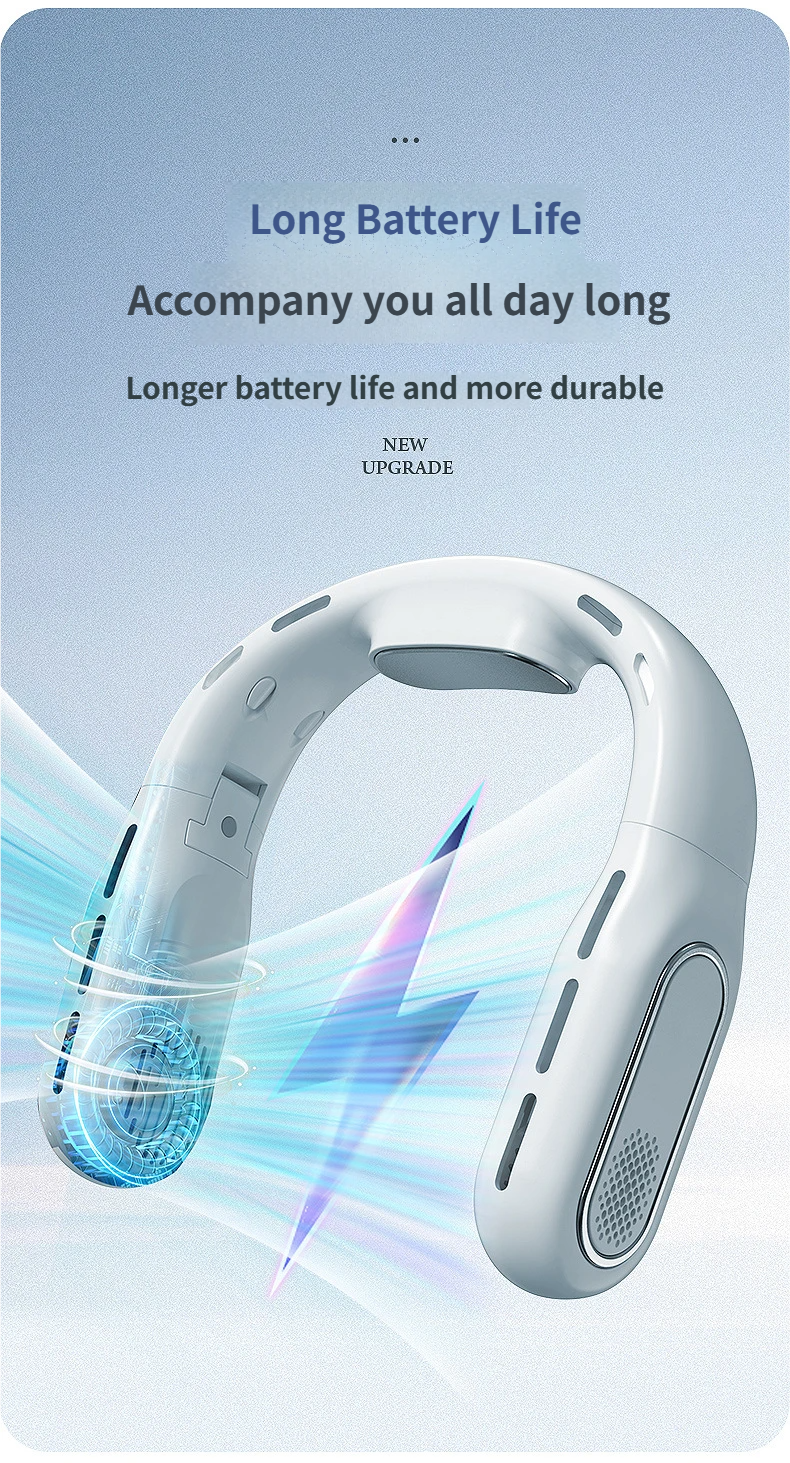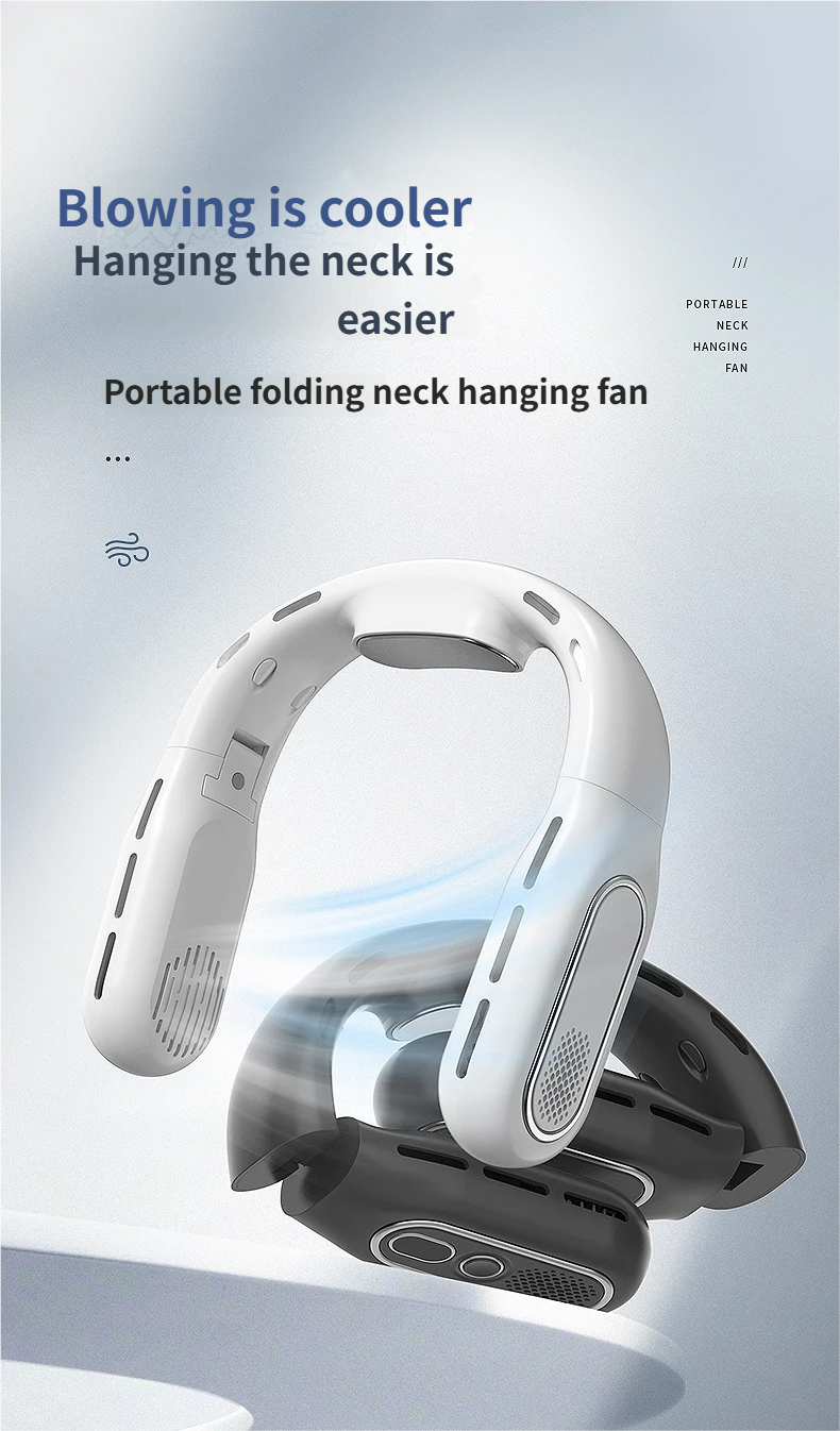 This portable hanging neck fan is designed for outdoor activities and daily use, available in classic black and white. Equipped with a brushless motor and condenser sheet, it delivers soft and cool wind with noise below 36dB, bringing you a comfortable cooling experience without disturbing. With foldable design, digital display and 8-12 hours long battery life, it is not only a practical daily necessity but also an ideal gift for festivals, employee benefits and customer appreciation.