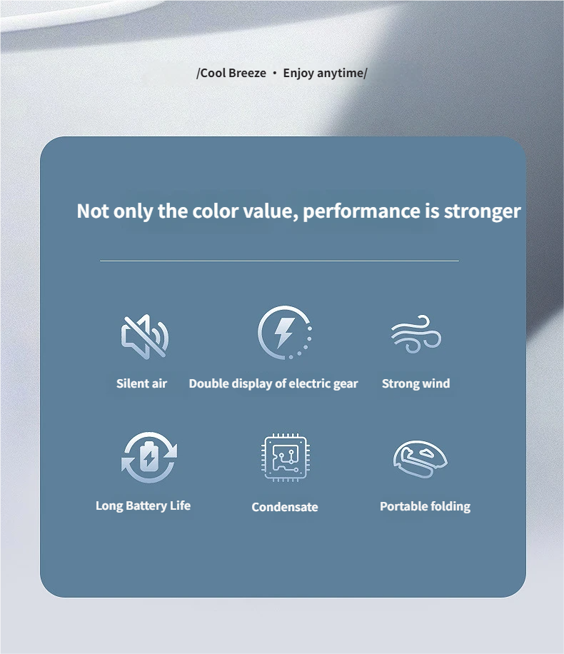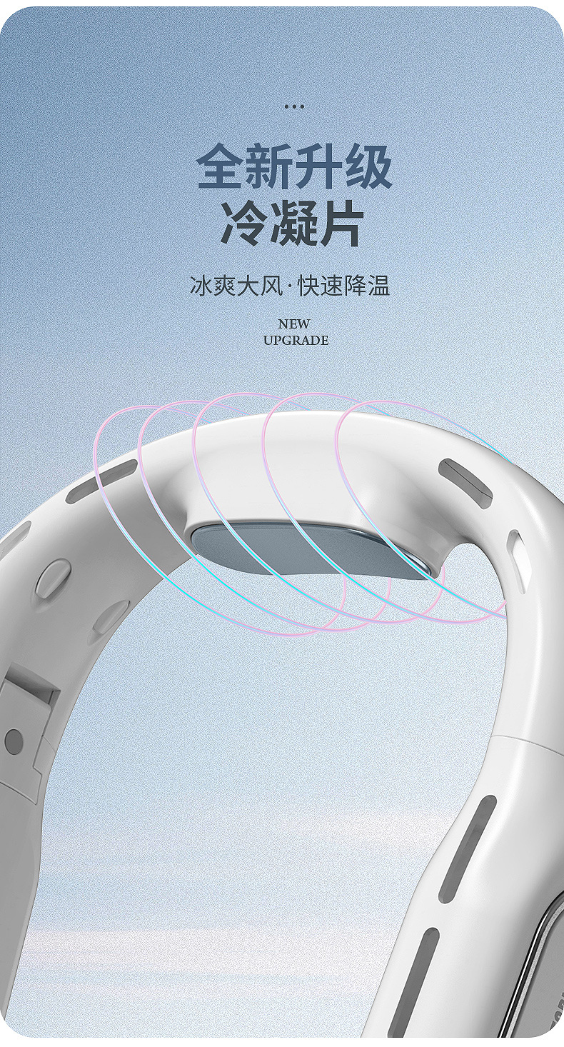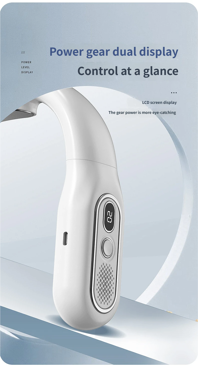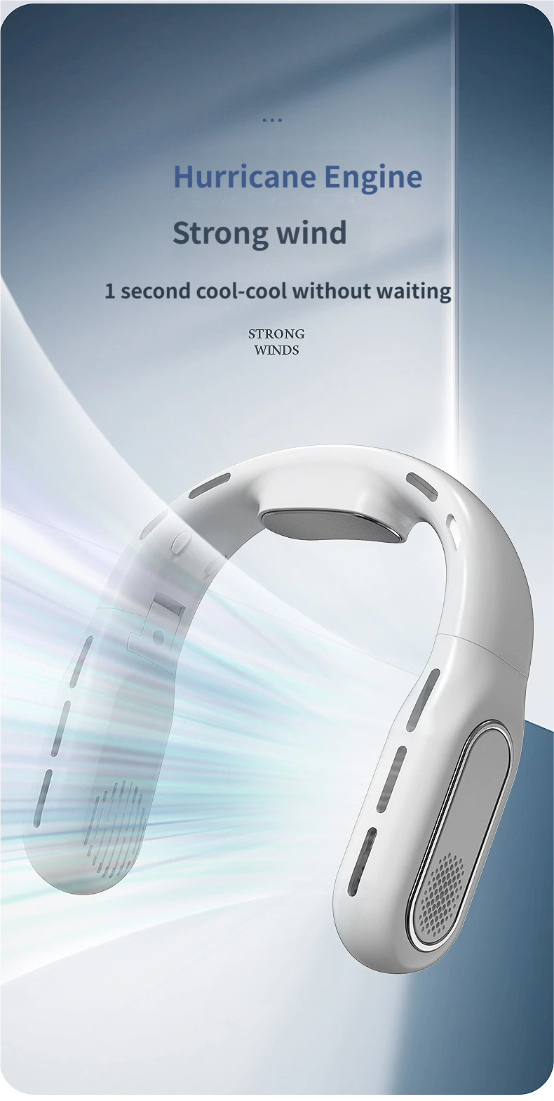 This portable hanging neck fan is designed for outdoor activities and daily use, available in classic black and white. Equipped with a brushless motor and condenser sheet, it delivers soft and cool wind with noise below 36dB, bringing you a comfortable cooling experience without disturbing. With foldable design, digital display and 8-12 hours long battery life, it is not only a practical daily necessity but also an ideal gift for festivals, employee benefits and customer appreciation.