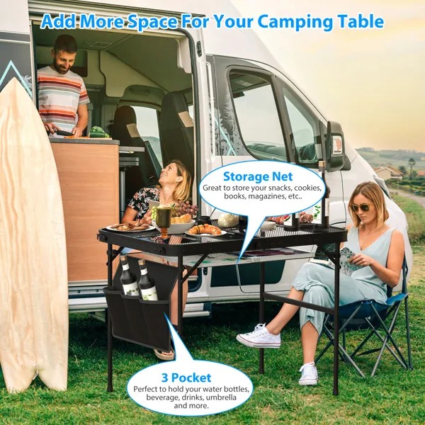 Under table hanging storage net quipped with 4 clips is specially designed for 35.43x23.62 camping table with 0.89in-diameter side pole. Great to add more space for your table when you're camping, hiking, fishing or other outdoor activities. 29.53x19.69in Net is able to hold your snacks, cookies, magazines and the 3 side pockets are perfect to hold your water bottles, beverage and umbrella. It's easy to set up with seconds.