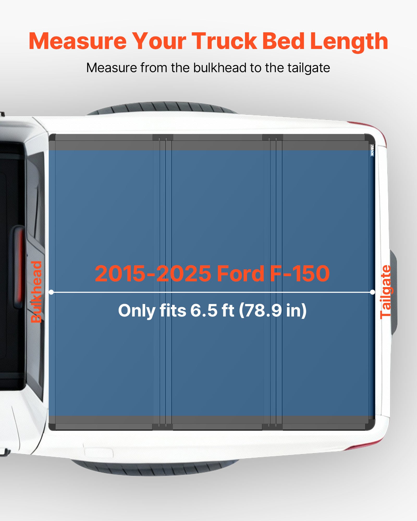 Vehicle Compatibility: This hard tri-fold truck bed tonneau cover fits 2015-2025 Ford F150 with 6.5 ft (78.9 in) standard bed. Note: Please measure your truck bed size before purchase to ensure fit