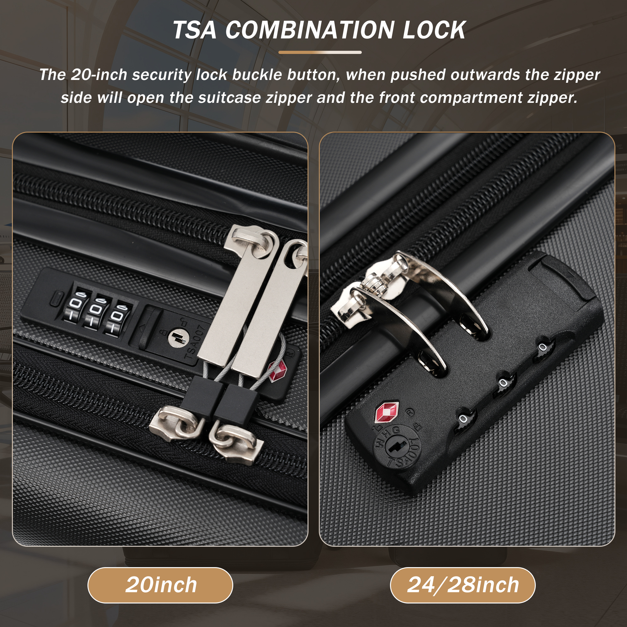 Instructions for Reset the 3 Digit Secure TSA Lock--20 inch The original combination is 0-0-0. To set your own combination, please follow these steps: 1) With the lock in the 0-0-0 position. 2) Press down the reset button [A] with a pen or other tool until you hear a "click"sound. 3) Set your own combination by turning the dials [B]. For example, 8-8-8. 4) Push the button [C] in the direction of the arrow until you hear the "click"sound again, confirming that you have set your personal combination. Instructions for Reset the 3 Digit Secure TSA Lock--24 & 28 inch 1. The initial password of lock is 0-0-0. 2.Press the reset hole with the tip of the pen. 3.Set the new 3-digit code while pressing. 4.Now you can open the lock with the new password.