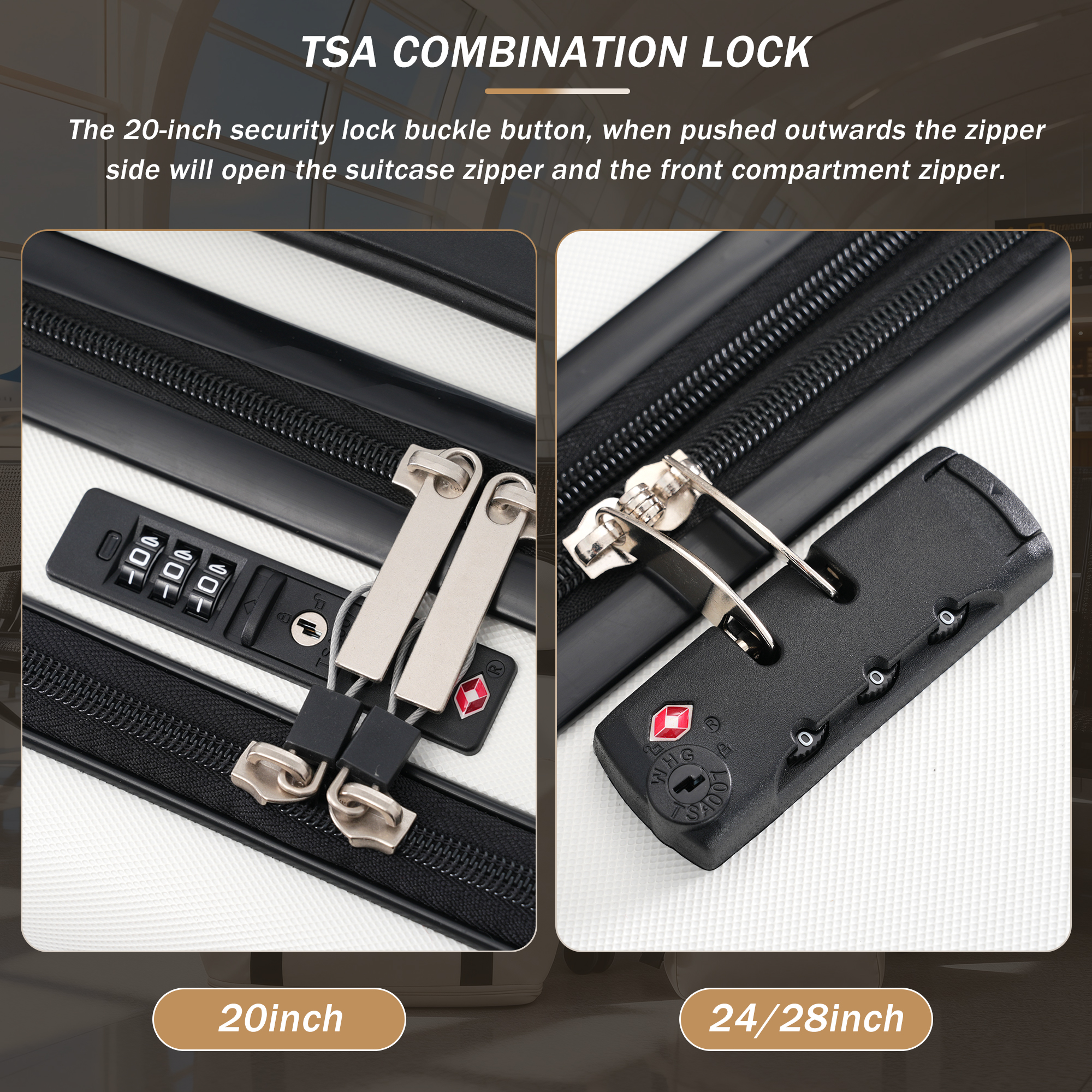 Instructions for Reset the 3 Digit Secure TSA Lock--20 inch The original combination is 0-0-0. To set your own combination, please follow these steps: 1) With the lock in the 0-0-0 position. 2) Press down the reset button [A] with a pen or other tool until you hear a "click"sound. 3) Set your own combination by turning the dials [B]. For example, 8-8-8. 4) Push the button [C] in the direction of the arrow until you hear the "click"sound again, confirming that you have set your personal combination. Instructions for Reset the 3 Digit Secure TSA Lock--24 & 28 inch 1. The initial password of lock is 0-0-0. 2.Press the reset hole with the tip of the pen. 3.Set the new 3-digit code while pressing. 4.Now you can open the lock with the new password.