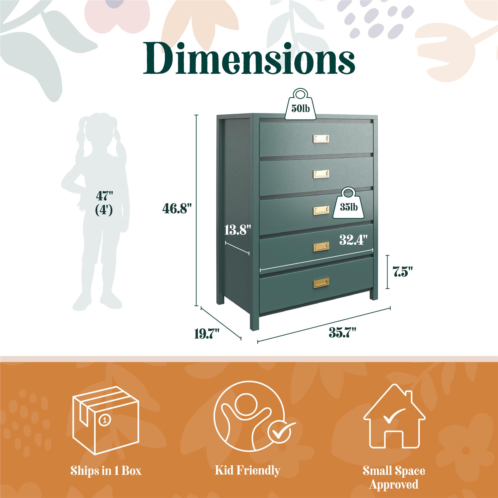 Equipped with storage bins and laundry hampers, you navigate your child's room like a pirate searching for hidden treasure, dodging piles of clothes and toys. If only there was a magical chest to keep this chaos at bay! Enter the Haven 5-Drawer Kids' Dresser. With its crisp finish and fashionable gold drawer pulls, this campaign-style dresser will be the perfect storage solution for your child or teen's sea of clothes that even they will enjoy using. The Haven 5-Drawer Kids' Dresser features durable metal drawer slides with built-in stops for safety. The kids' dresser is Sturdy Compliant, meets CPSIA Juvenile testing requirements, and includes a wall anchor kit to ensure your child's safety.