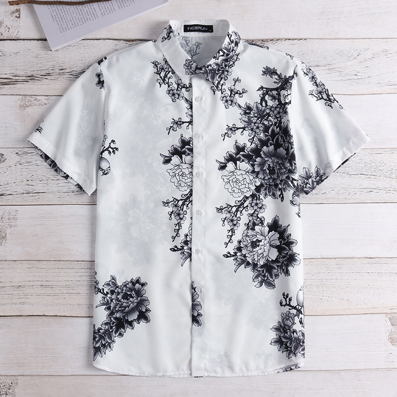 Color: Hawaiian blue flower short sleeve shirt, Hawaiian gray flower short sleeve shirt