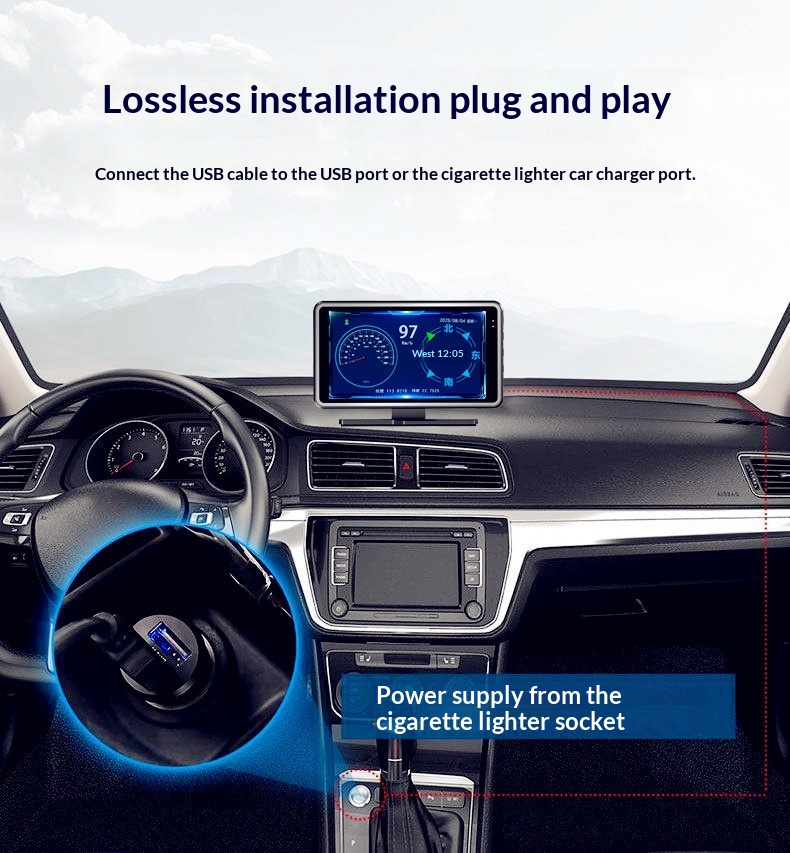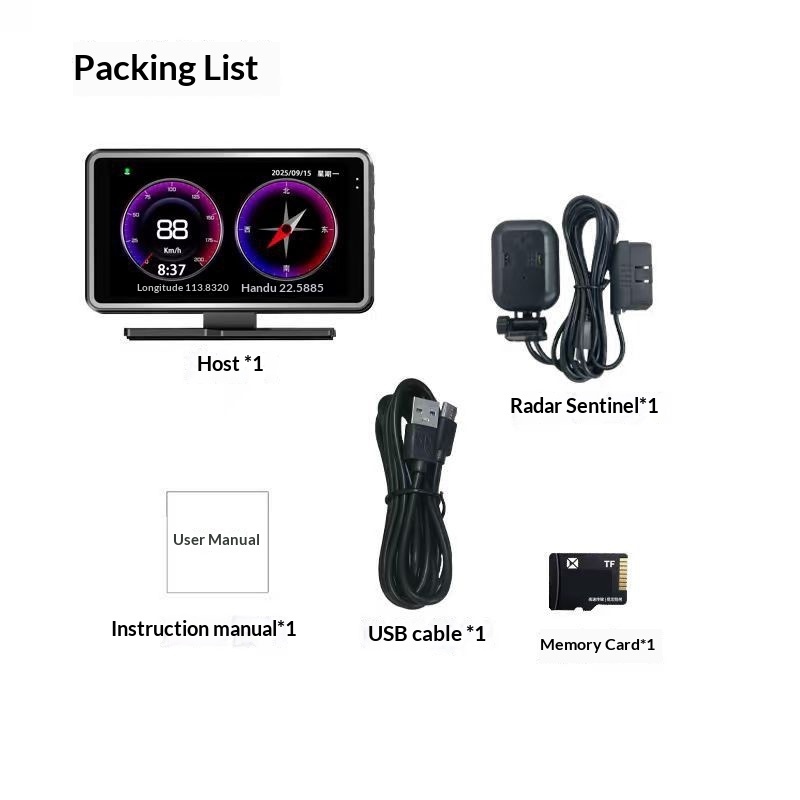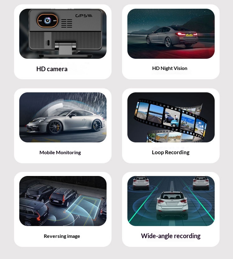 Functions: Speed measurement on the go, motion detection, loop recording, fixed speed cameras, driver fatigue warning, speed limit sign alerts, front and rear recording