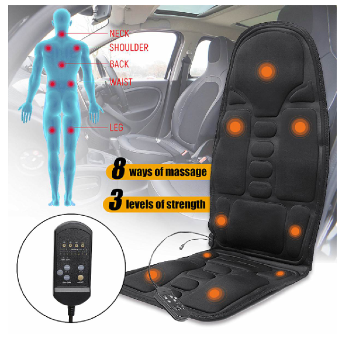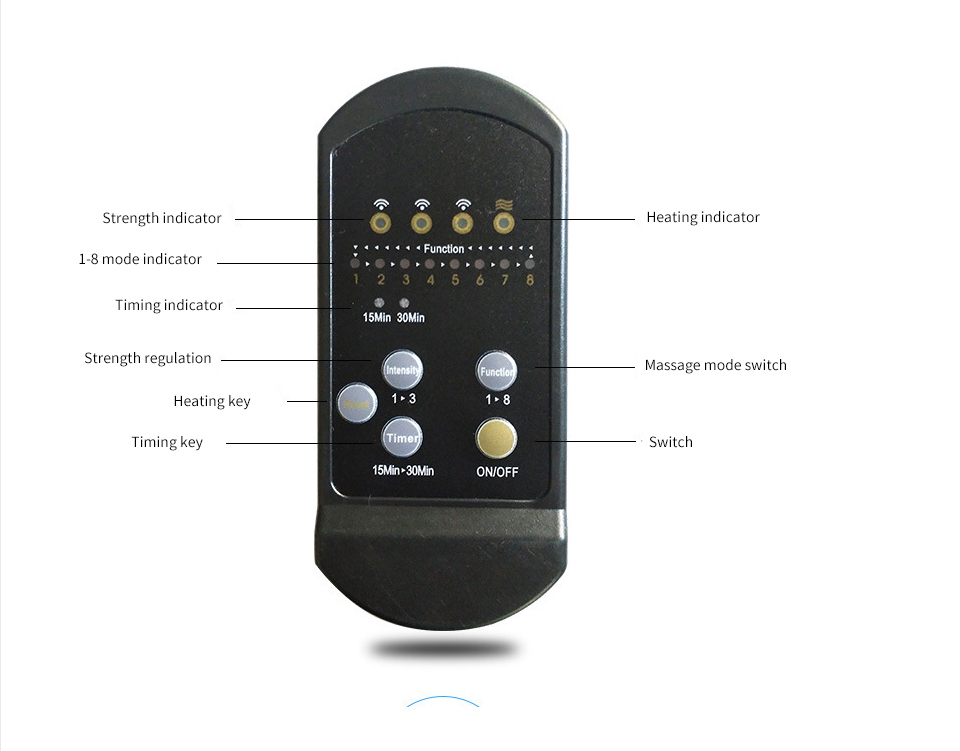 This product adopts 12V safety regulated power supply, microcomputer control, 8 kinds of massage modes free exchange, 5-30 minutes adjustable timing, automatic shutdown, multi-function all-round vibration massage, dual-use compartment, portable, can sit and lie.