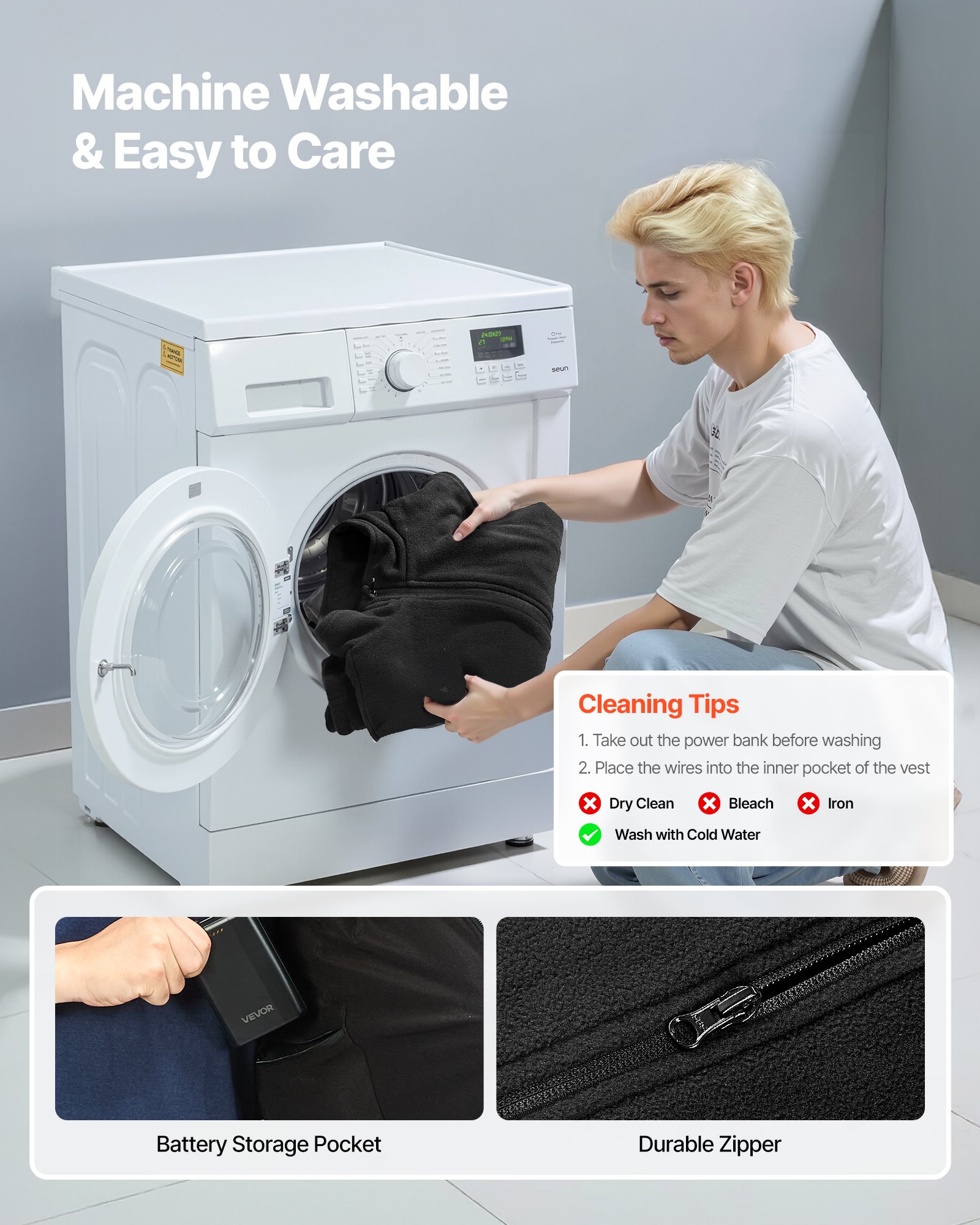 Easy Care: The heating vest is machine washable, making cleaning effortless. Please take out the power bank and place the vest’s wires inside the inner pocket before washing