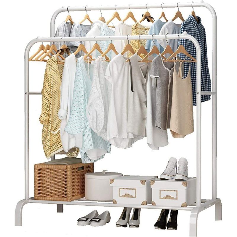 Practical Product Design: The bottom of the garment rack is a small shoe rack, you can use it to place shoes or shoe boxes, it not only gives you more storage space, it also makes the garment rack more stable.There are two non-slip beads on the top of the garment rack, which not only prevents the clothes from falling off, but also makes the garment rack look more beautiful.