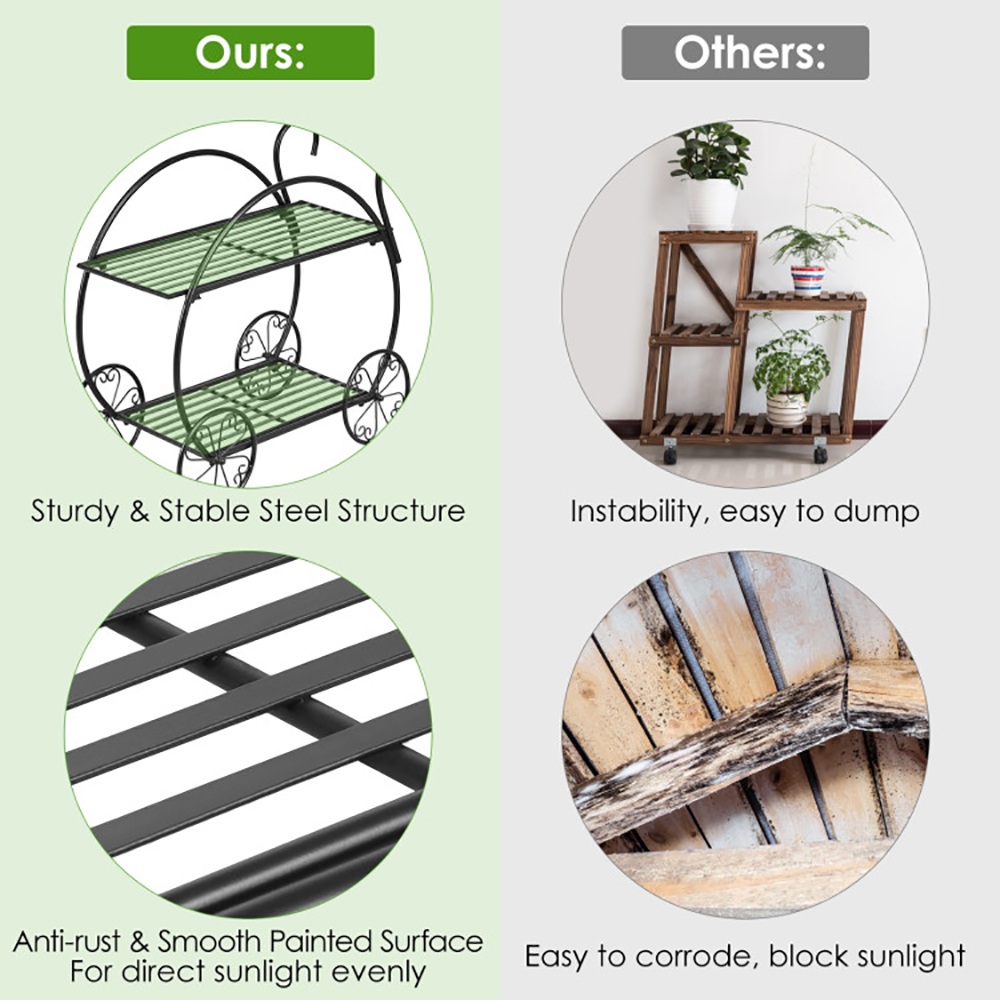 ● Decorative and Practical Function: Its shape looks like a Parisian trolley cart with round wheels. It can perfectly serve as a exquisite and classic decoration. There are two tiers in total and each tier is wide enough for you can put your plant pot or flowers on.