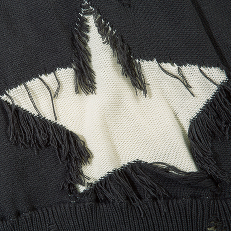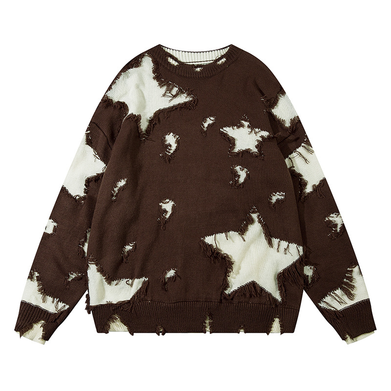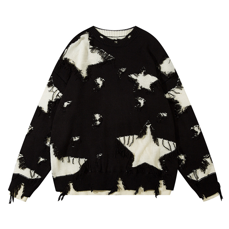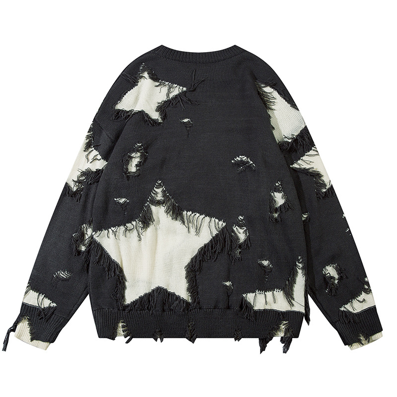 Heavy Industry Destroyed Color Matching Five-pointed Star Round Neck Sweater