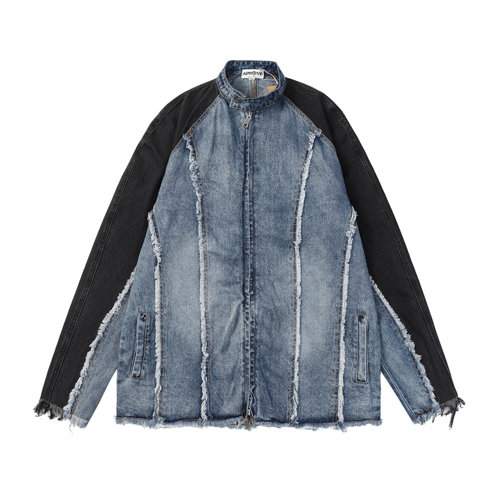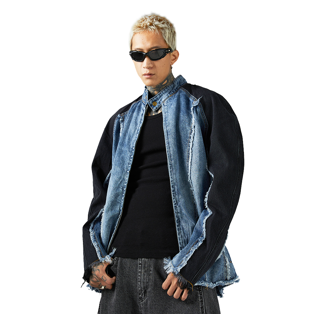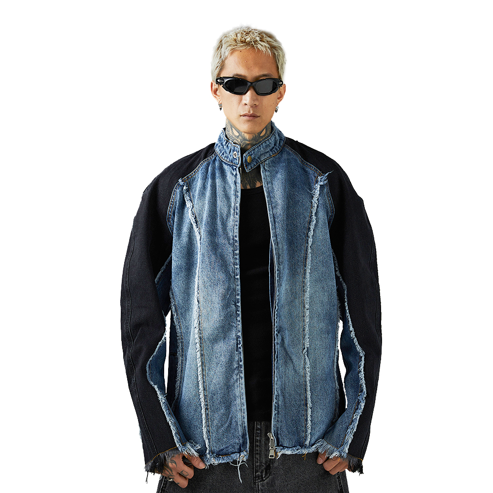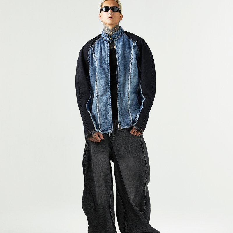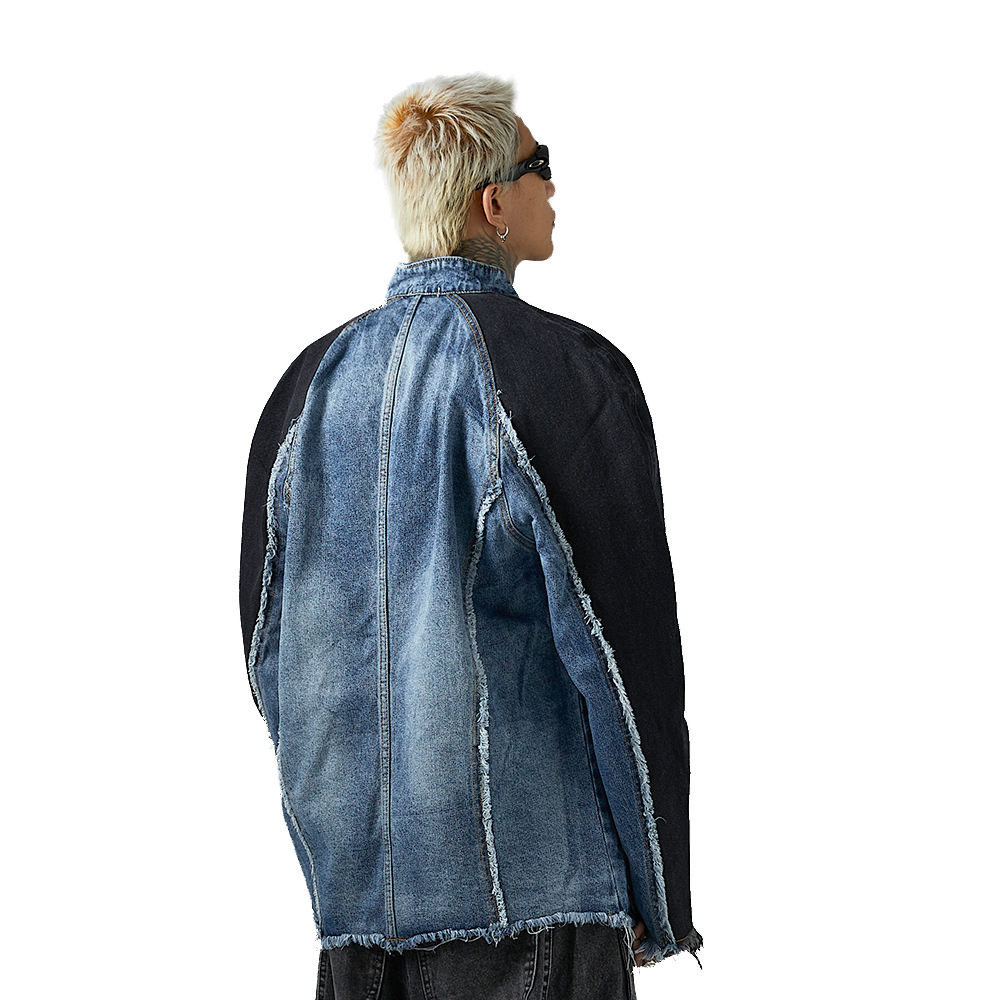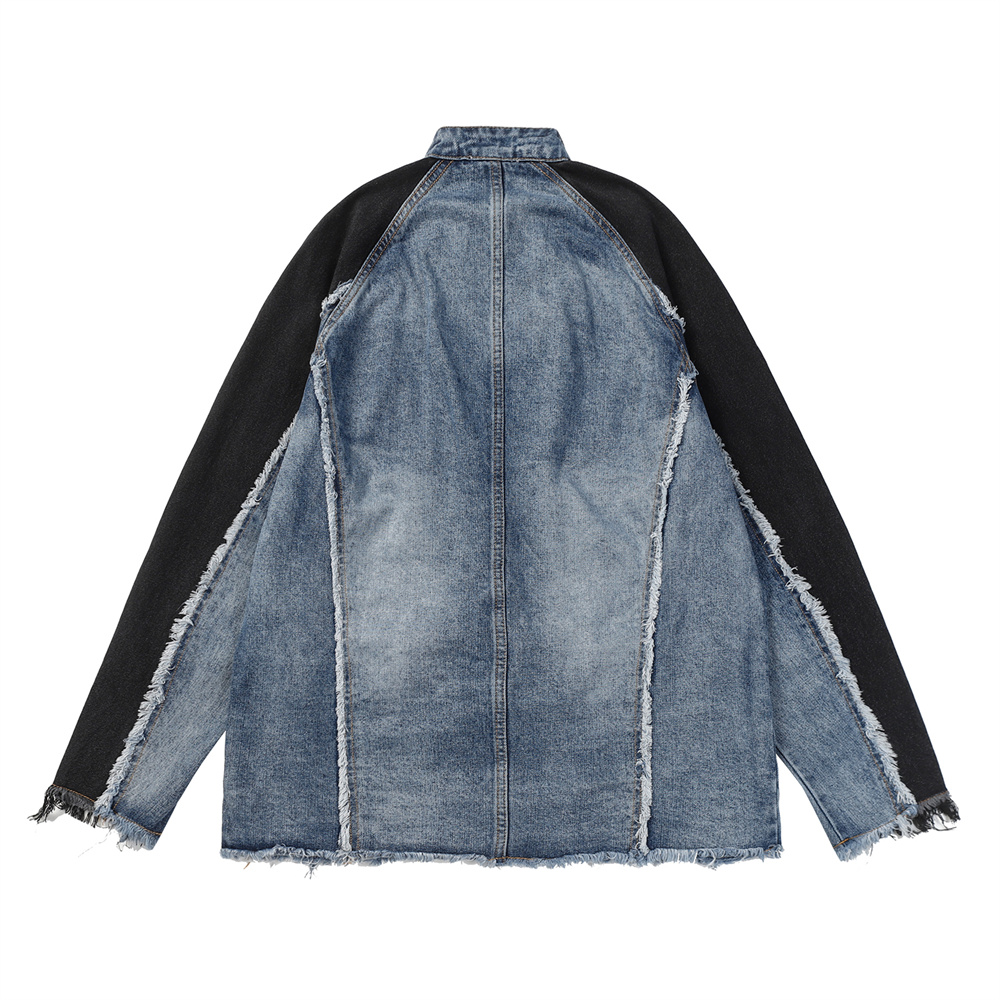 Heavy Industry Distressed Cat Raw-cut Edges Color Matching Machete Sleeve Wash Stand Collar Denim Coat