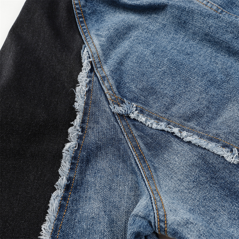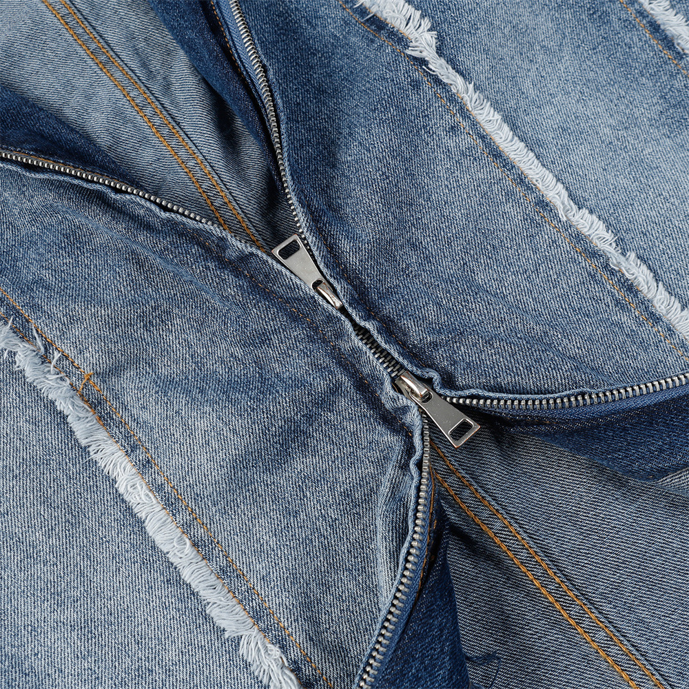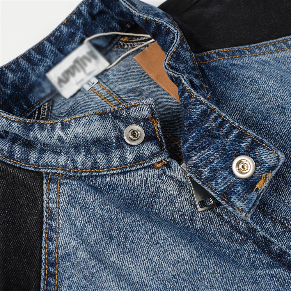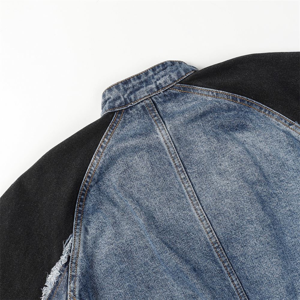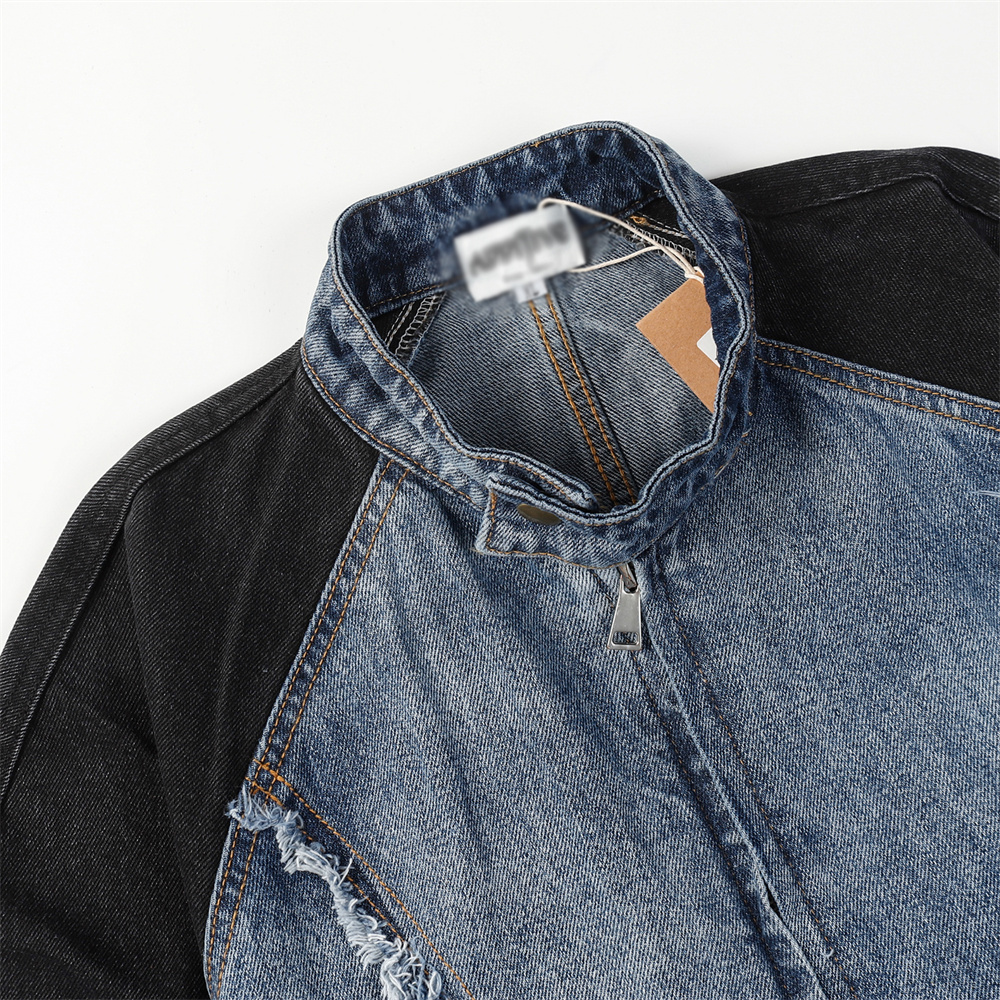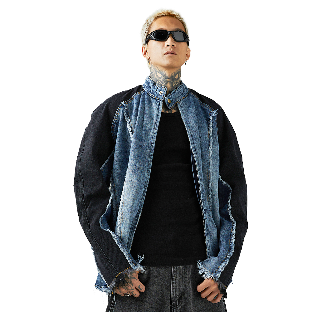 Heavy Industry Distressed Cat Raw-cut Edges Color Matching Machete Sleeve Wash Stand Collar Denim Coat