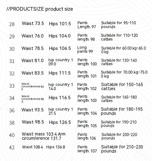 Size: 28 suitable for 47.50 kg-55.00 kg, 29 suitable for 55.00 kg-60.00 kg, 30 suitable for 60.00 kg-65.00 kg, 31 suitable for 65.00 kg-70.00 kg, 32 suitable for 70.00 kg-75.00 kg, 33 suitable for 75.00 kg-82.50 kg, 34 suitable for 82.50 kg-90.00 kg, 36 suitable for 90.00 kg-97.50 kg, 38 suitable for 95.00 kg-105.00 kg, 40 suitable for 100.00 kg-110.00 kg, 42 suitable for 105.00 kg-115.00 kg