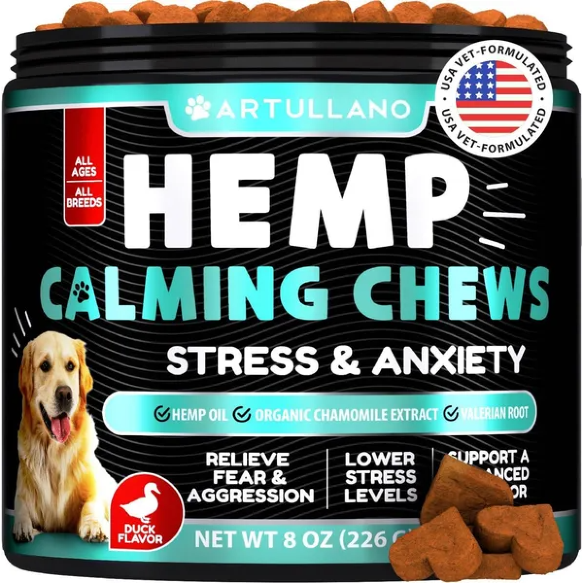 stress & anxiety relief: dog calming chews include valerian root & chamomile extract that help promote calmness and reduce jumping, biting, & barking for dogs with aggressive or hyperactive behavior.