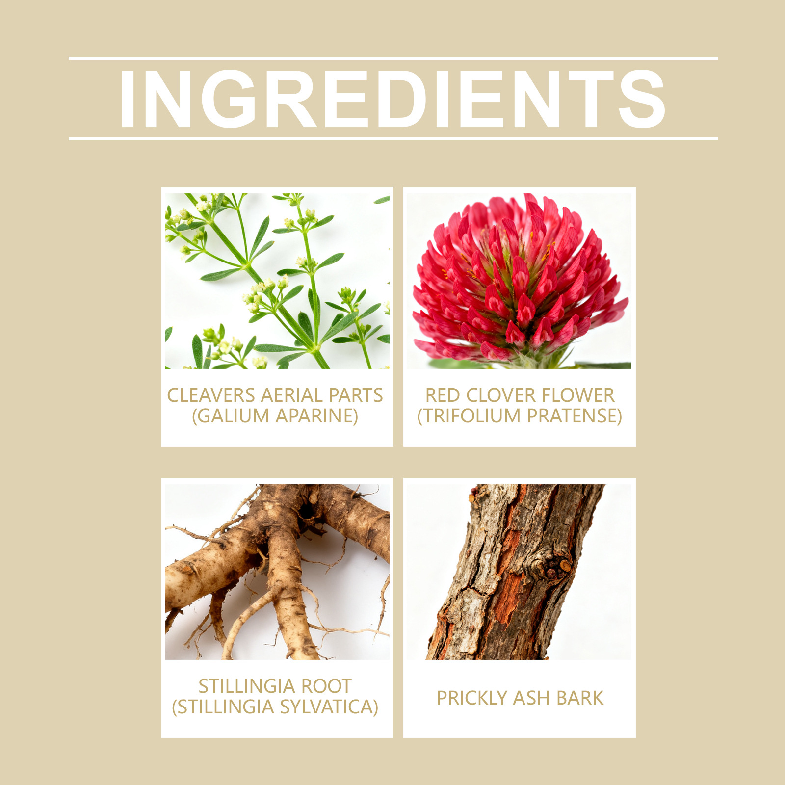Product information:Ingredients: Galium aparine, Trifolium pratense, Stillingia sylvatica and Zanthoxylum bungeanum bark.
