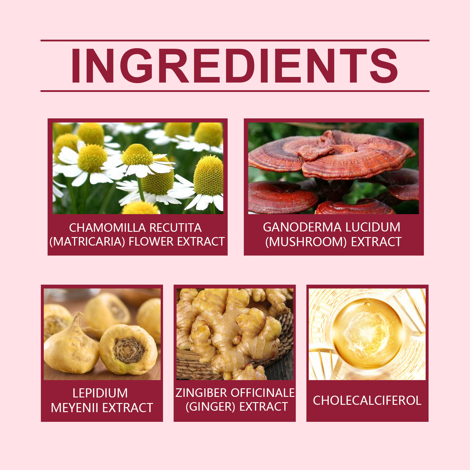 Ingredients: ginger extract, vitamin D3, Ganoderma lucidum extract, macroot extract, mother chrysanthemum extract
