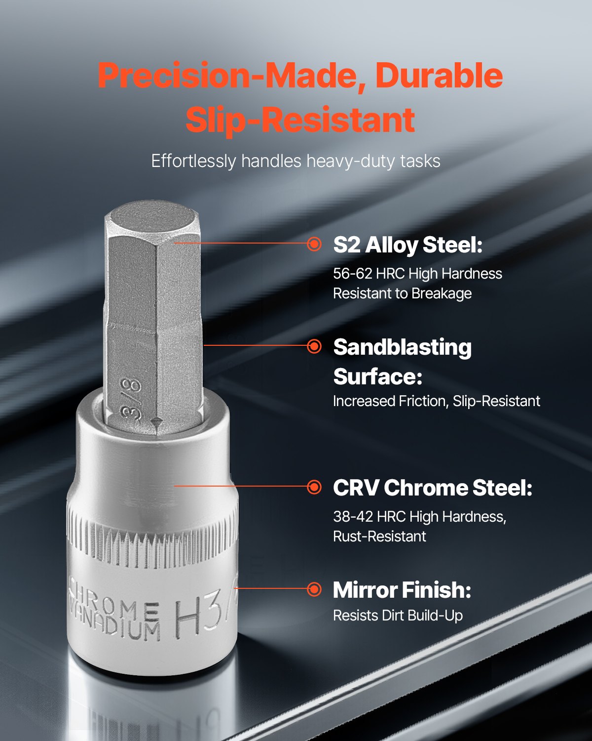 Rustproof & Durable: Constructed from high-hardness S2 alloy steel and CRV chrome-plated steel, the hex bit socket set surfaces feature sandblasting and mirror polishing. This design resists breakage and corrosion, ensuring years of reliable use.