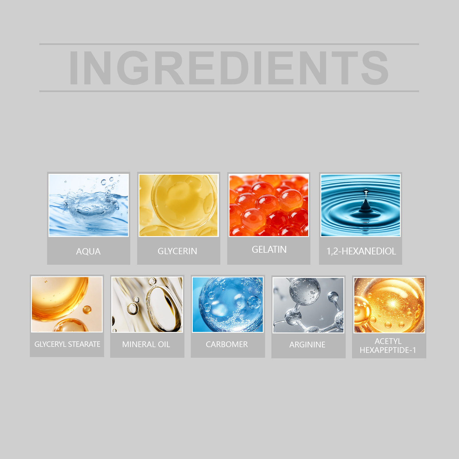 Ingredients: water, glycerin, gelatin, 1,2- hexanediol, mineral oil, glyceryl stearate, carbomer, arginine, acetyl hexapeptide -1.
