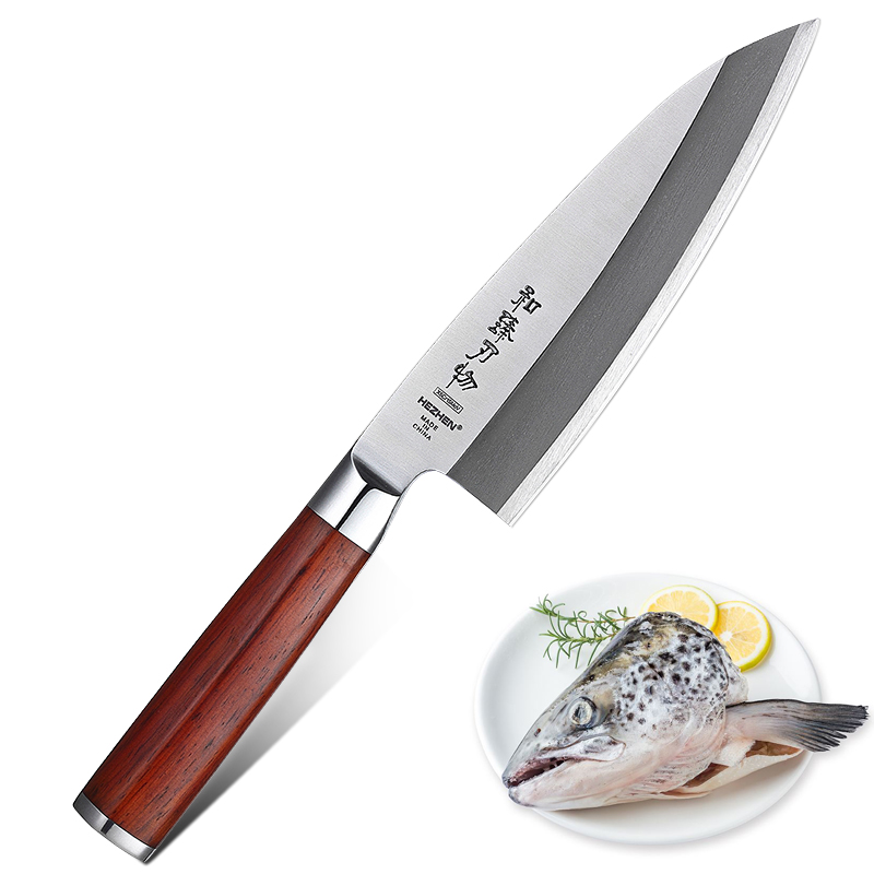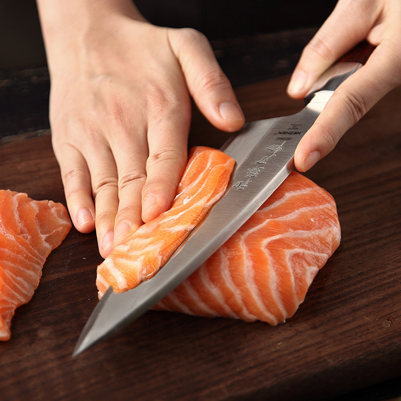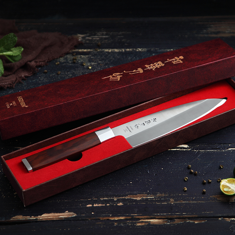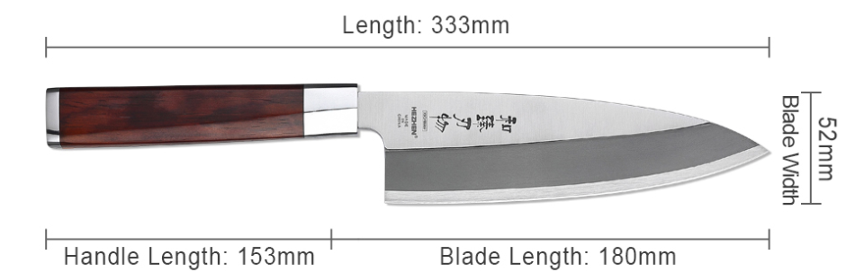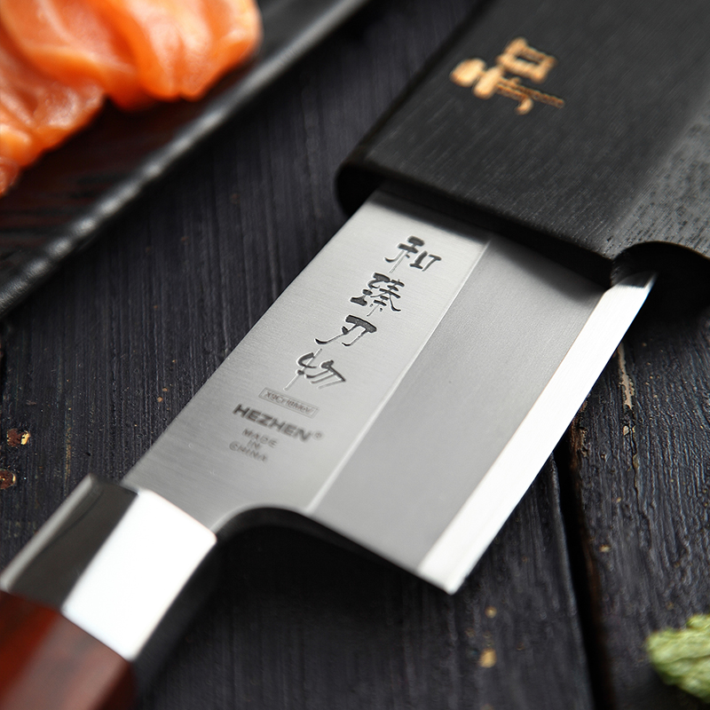 Hardness: 56HRCBlade material: molybdenum vanadium steelBlade thickness: 5.5mmHandle material: rosewoodCutting method: manual wet cutting