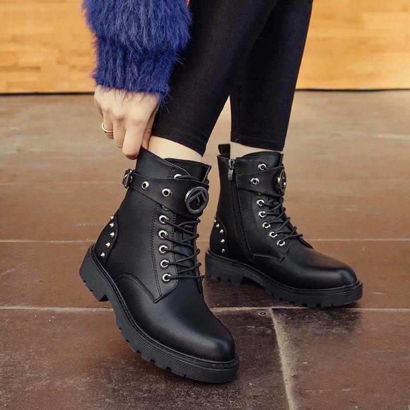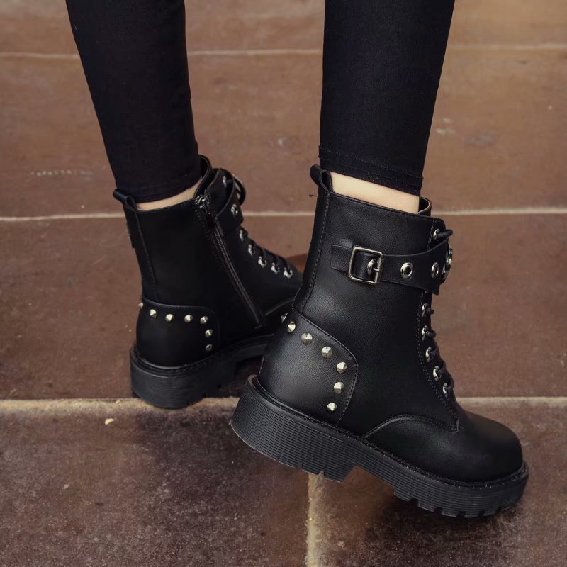 Upper Material: Artificial Pu Sole Material: Rubber Toe Shape: Round Toe Heel Shape: Thick Heel Heel Height: Low Heel (1-3Cm) Popular Boots: Martin Boots Popular Elements: Rivet