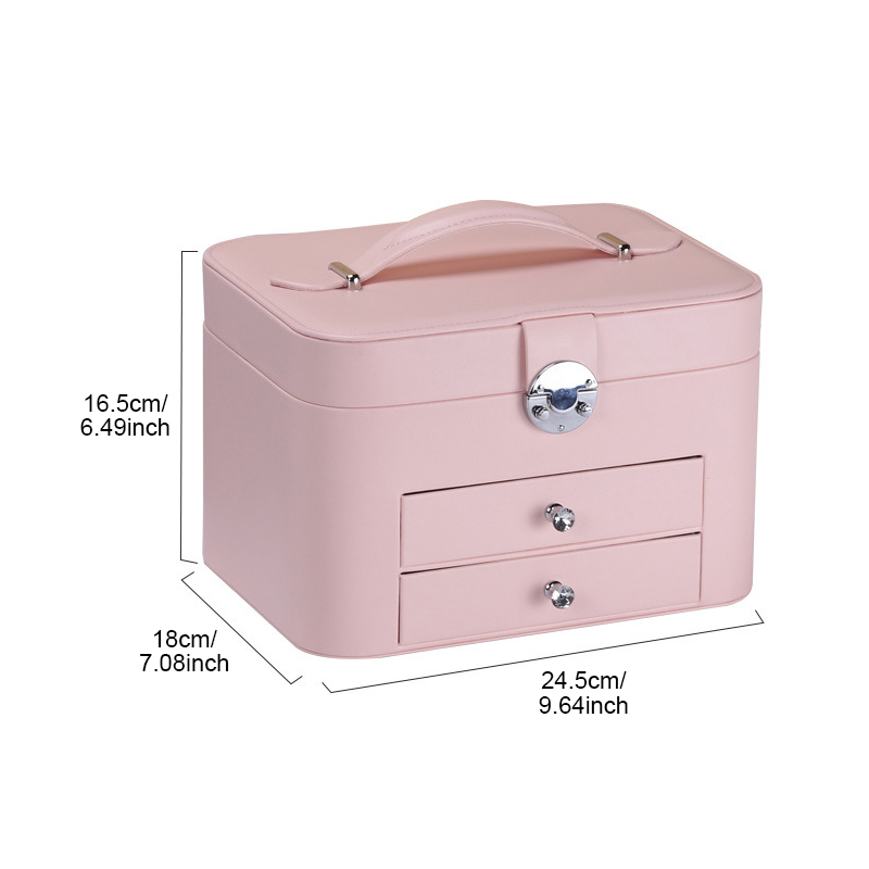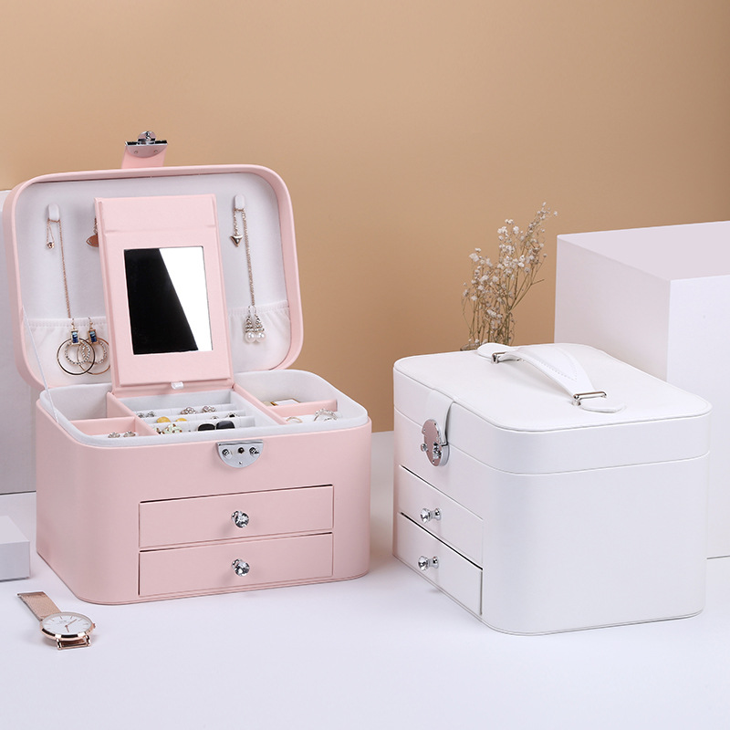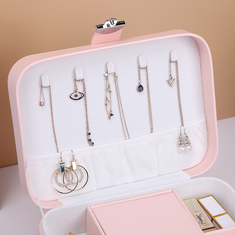 -4.The internal layout is reasonable and can accommodate rings, earrings, lipsticks, etc. The interior is equipped with necklace hooks and mesh pockets for other jewelry.