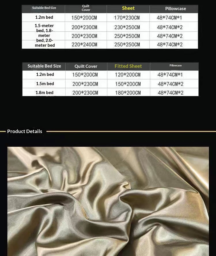Size specifications: 1.2m bed sheet set—4-piece set, including a duvet cover (150*200 cm), a fitted sheet (170*230 cm), and 2 pillowcases; 1.5m bed sheet set—4-piece set, including a duvet cover (200*230 cm), a fitted sheet (230*250 cm), and 2 pillowcases; 1.8m bed sheet set—4-piece set, including a duvet cover (200*230 cm), a fitted sheet (250*250 cm), and 2 pillowcases; 2.0m bed sheet set—4-piece set, including a duvet cover (220*240 cm), a fitted sheet (250*250 cm), and 2 pillowcases; 1.2m fitted bed sheet set—4-piece set, including a duvet cover (150*200 cm) and a fitted sheet (120*200 cm); 1.5m fitted bed sheet set—4-piece set, including a duvet cover (200*230 cm) and a fitted sheet (150*200 cm); 1.8m fitted bed sheet set—4-piece set, including a duvet cover (200*230 cm) and a fitted sheet (180*200 cm).