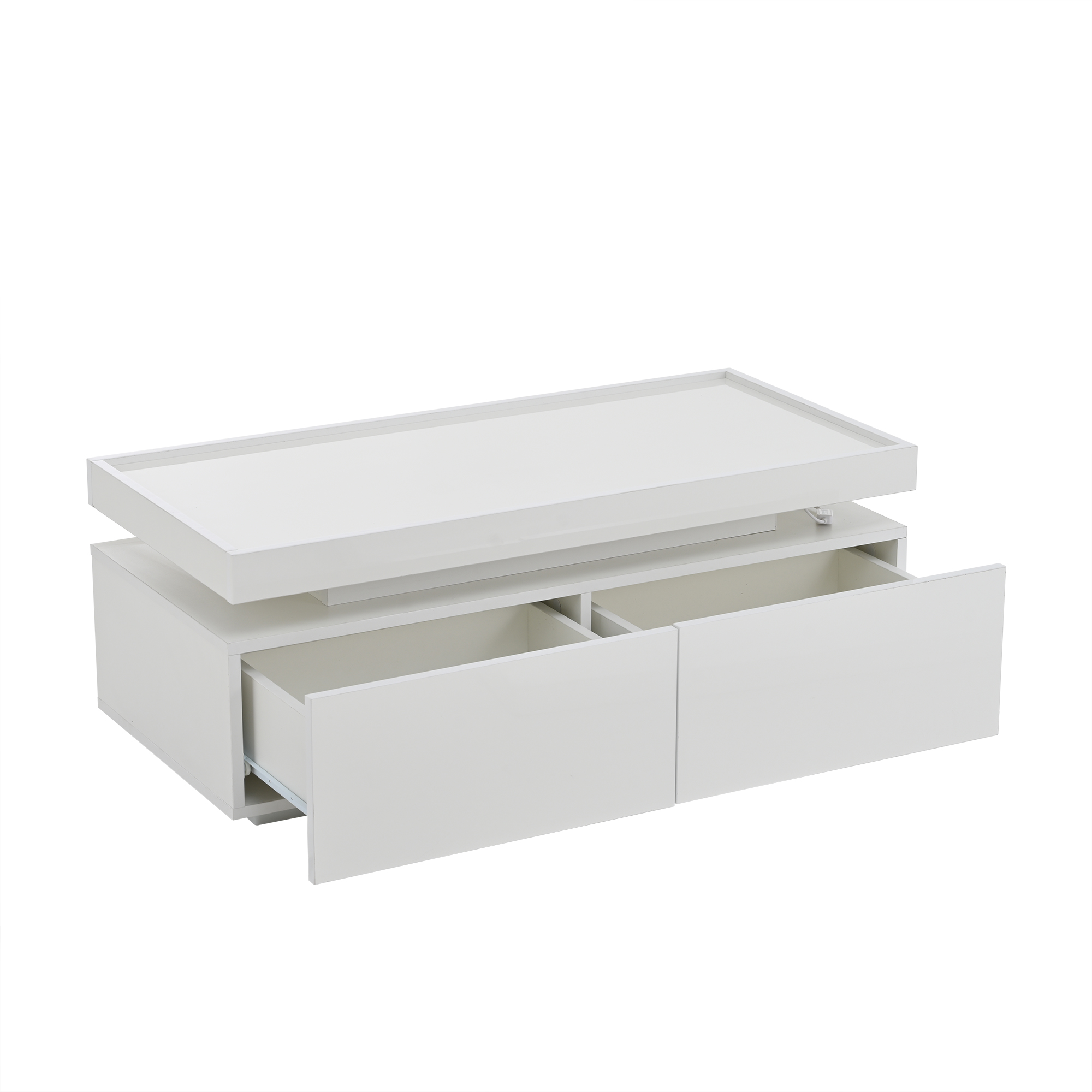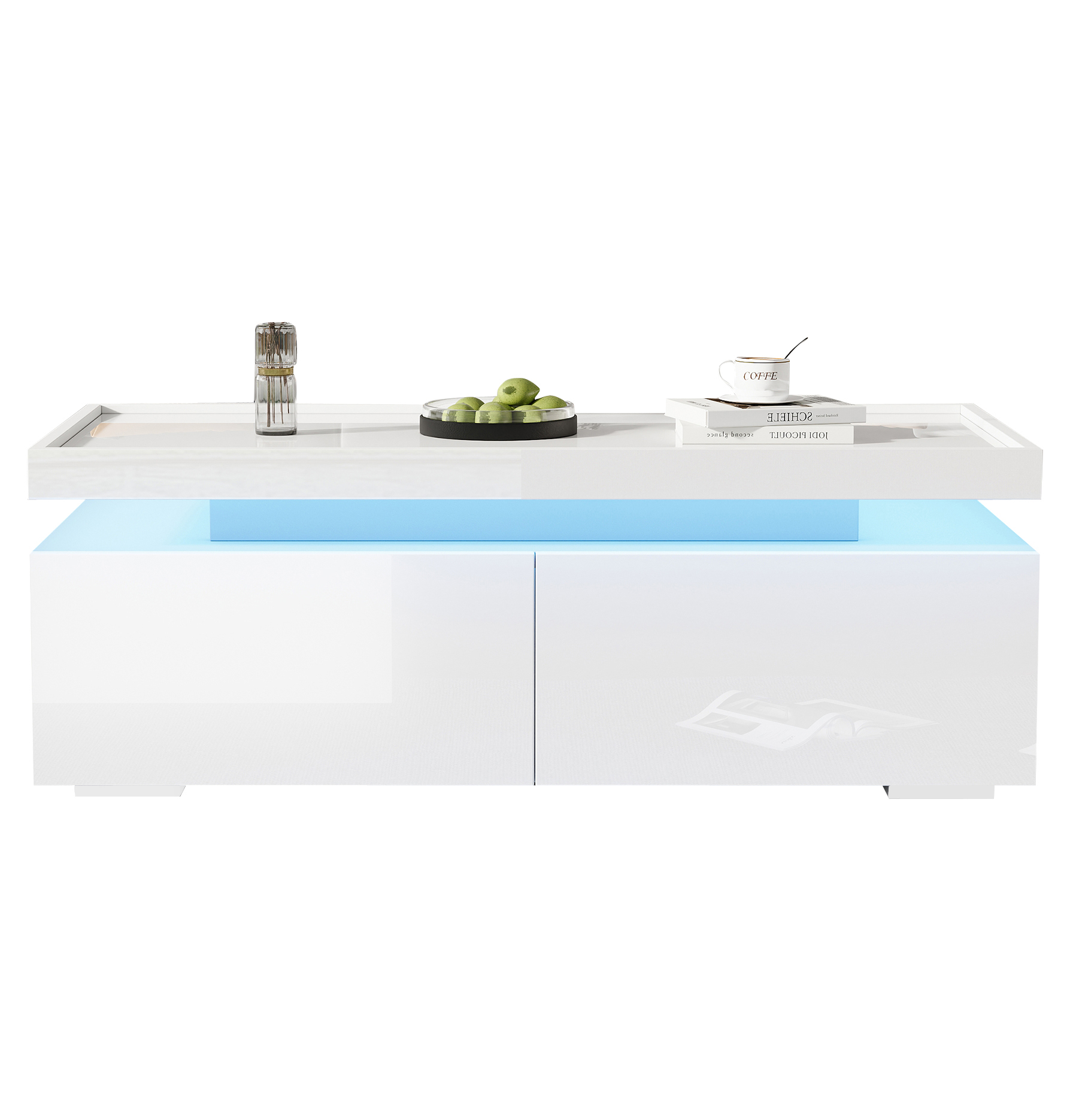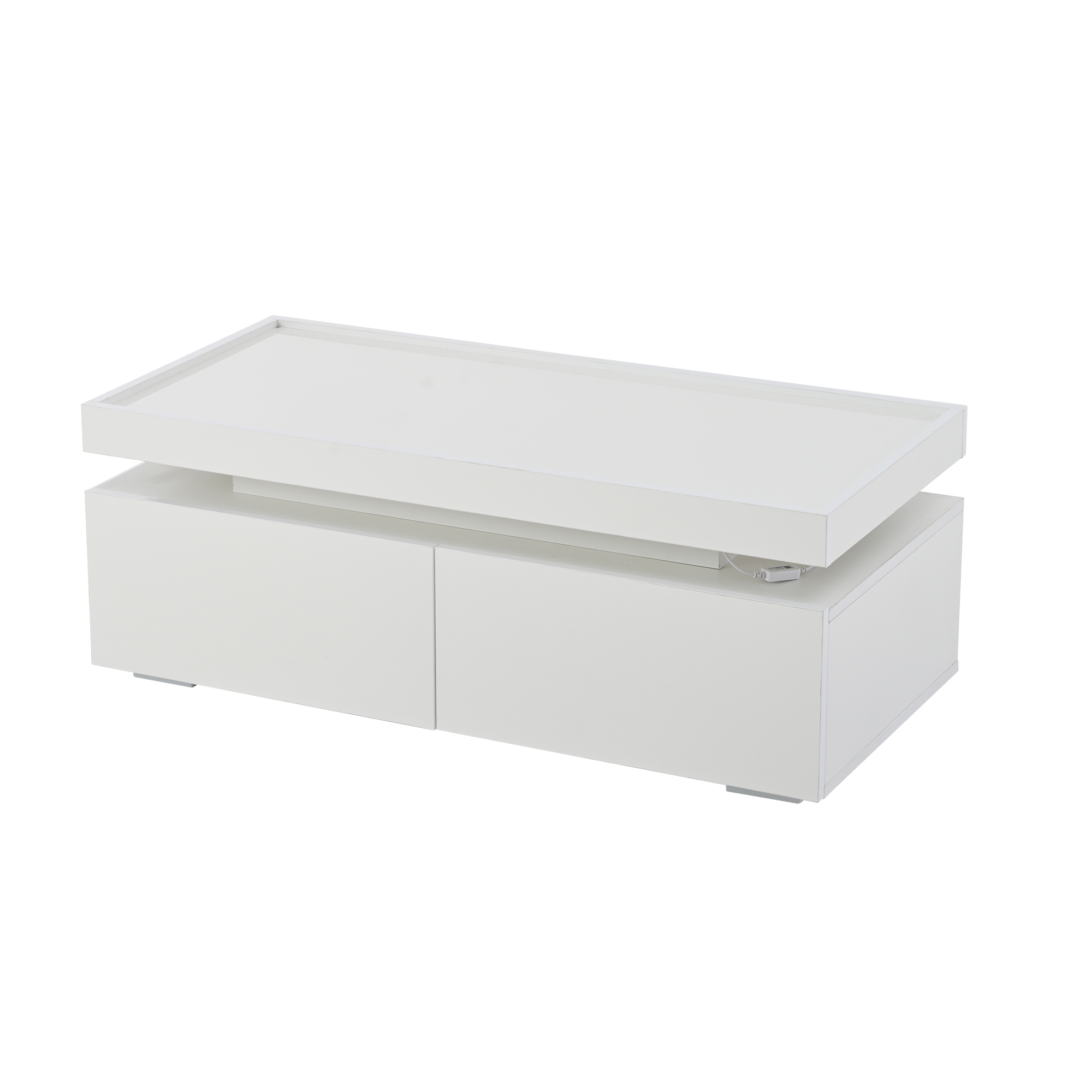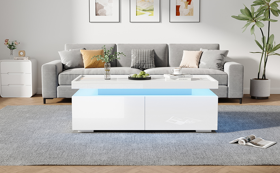Overall dimensions: 95 x 45 x 35 cm. White high-gloss coffee table with LED ambient lighting strip, controllable via mobile app. Modern minimalist design, large-capacity storage space with two drawers and a semi-open shelf in the middle for convenient placement of small items. When the LED light is on, the hollowed-out area in the middle creates a warm atmosphere. The tabletop uses a tray design, low in the middle and raised at the edges to prevent items from slipping and for comfortable use. Material: Particleboard; Total load capacity: 50 kg