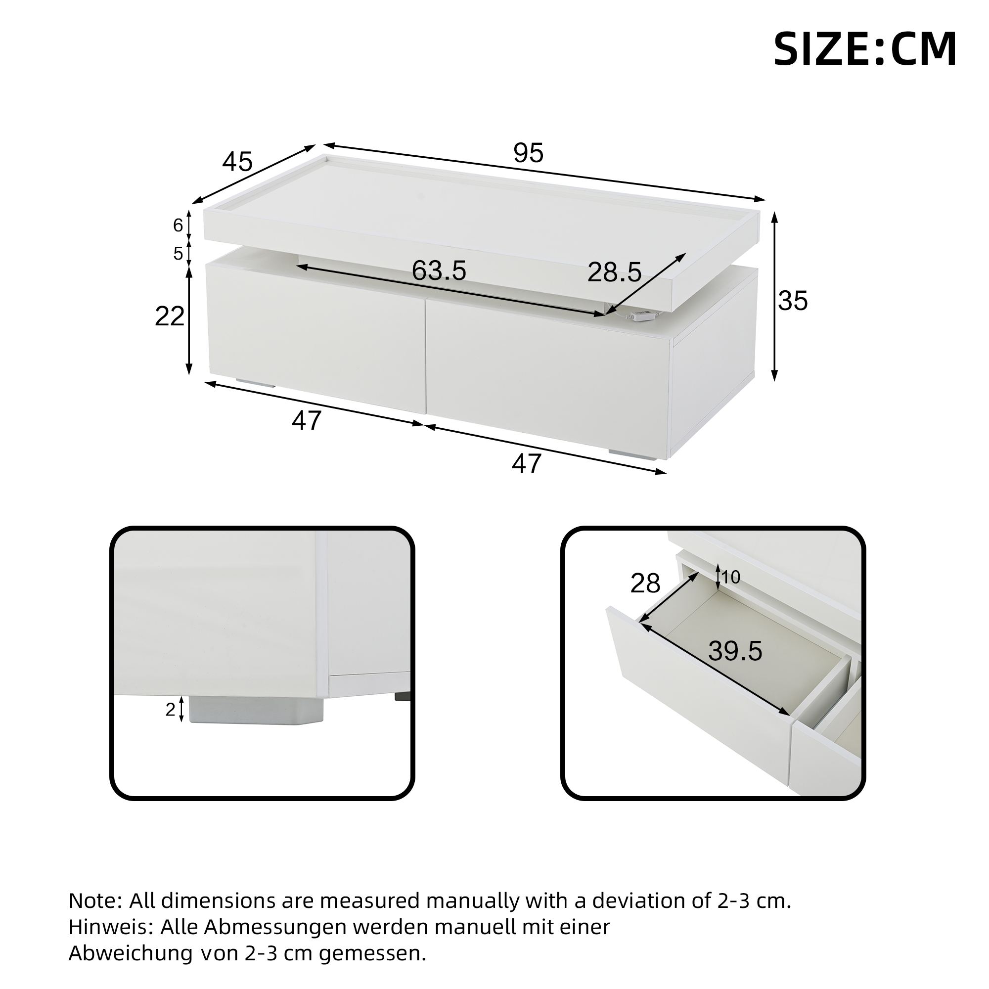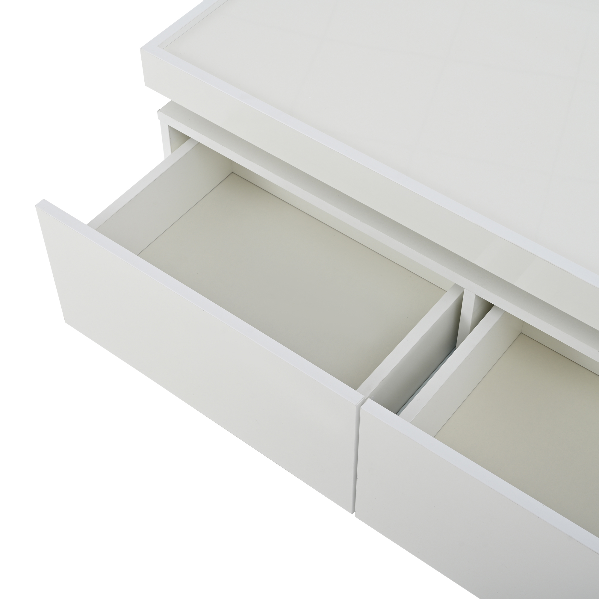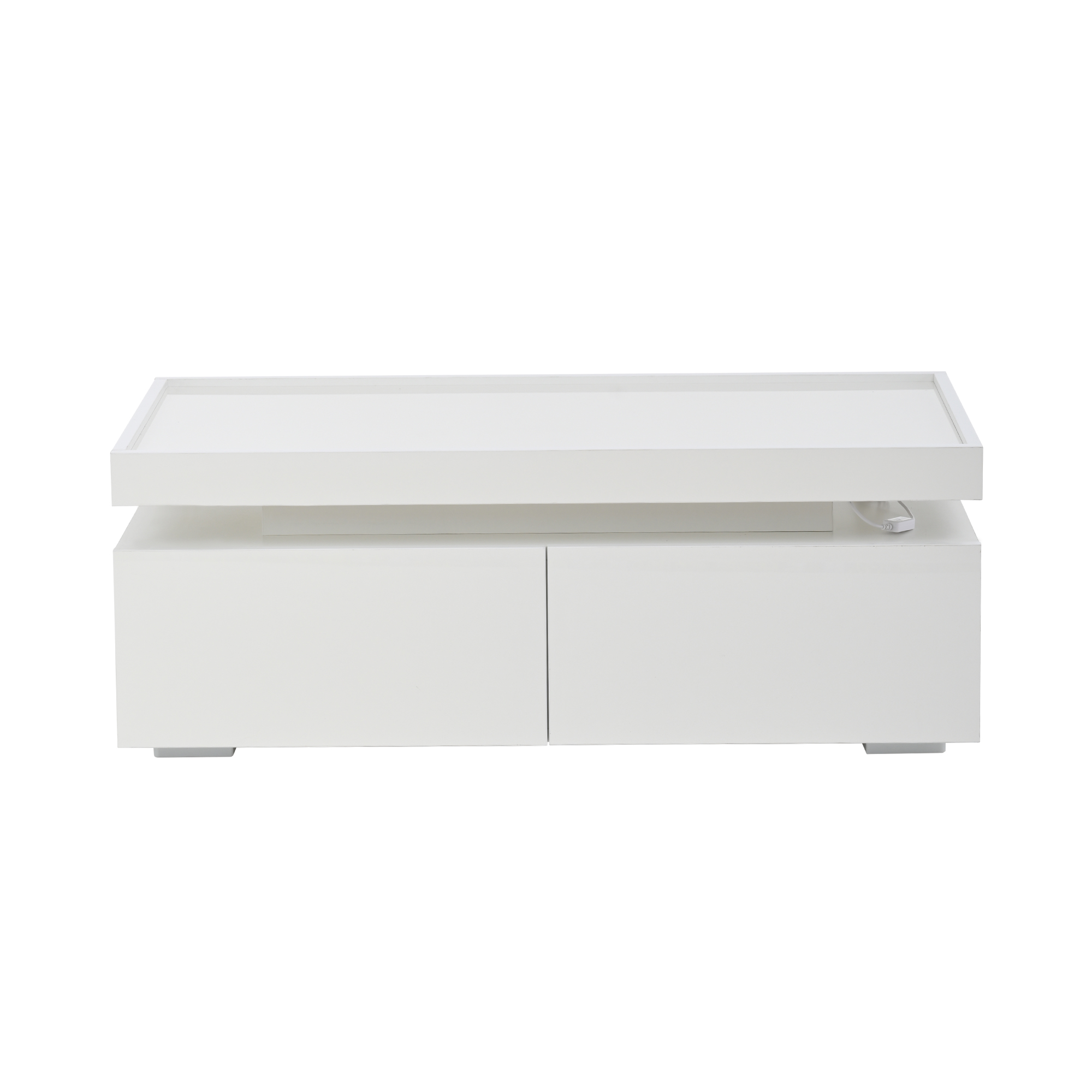 Overall dimensions: 95 x 45 x 35 cm. White high-gloss coffee table with LED ambient lighting strip, controllable via mobile app. Modern minimalist design, large-capacity storage space with two drawers and a semi-open shelf in the middle for convenient placement of small items. When the LED light is on, the hollowed-out area in the middle creates a warm atmosphere. The tabletop uses a tray design, low in the middle and raised at the edges to prevent items from slipping and for comfortable use. Material: Particleboard; Total load capacity: 50 kg