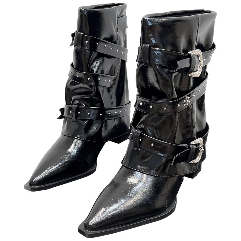 High-heeled Elegant Shaft-style Studded Belt-buckle Fashion Ankle Boots