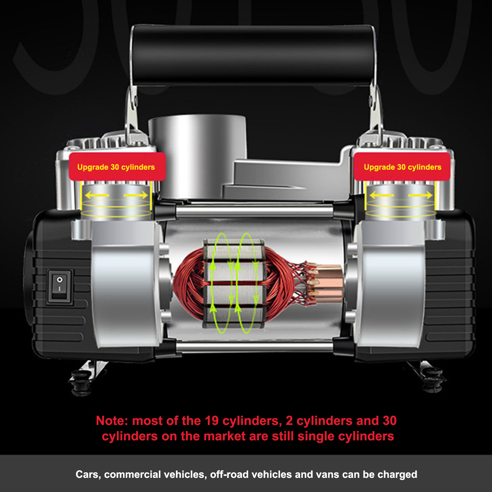 This machine is suitable for all 12V car tires, especially 4x4, medium buses, trucks under 2 tons, cars and other larger tires, with large air volume and fast inflation.
