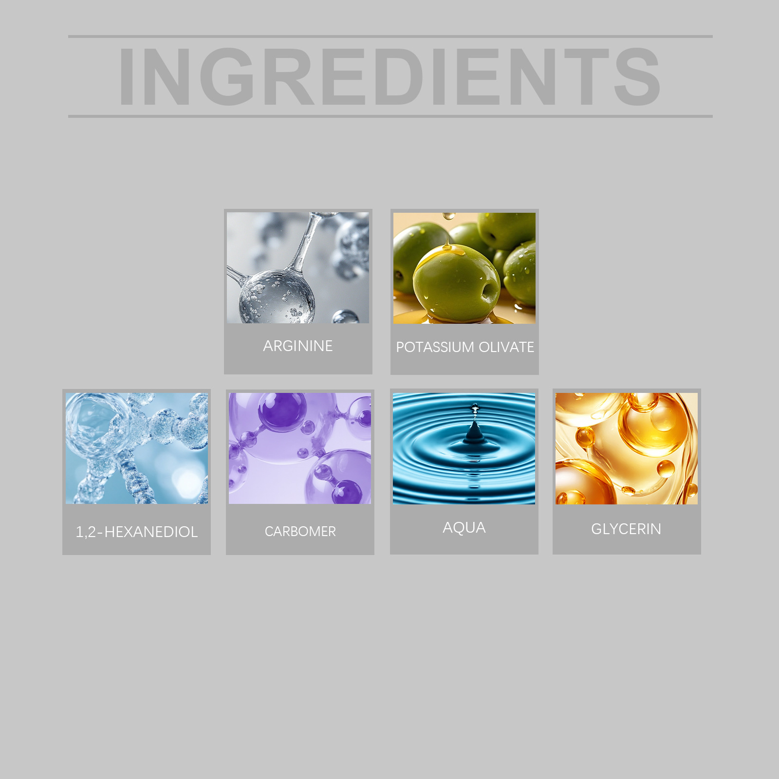 Product information:Ingredients: water, glycerin, 1,2- hexanediol, carbomer, arginine and olive oil.