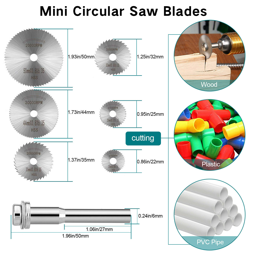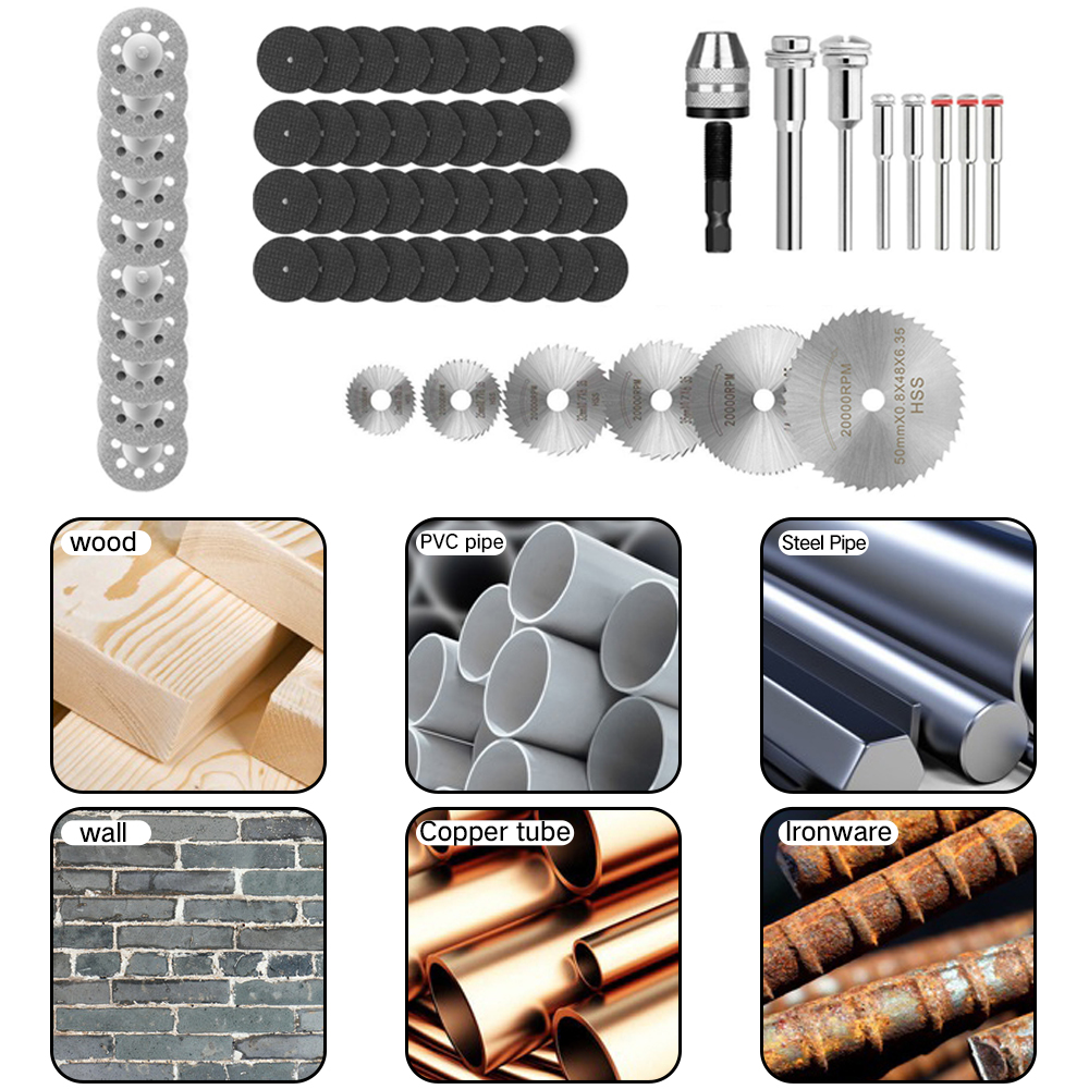 Product package: Including 6 × HSS wood cutting saw disc, 10 × diamond cutting wheel, 36 × resin cutting wheel, 6 × spindle and 1 x keyless chuck w / hexagonal handle