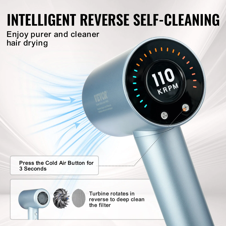 • Faster Hair Drying with High-Speed Brushless Motor: VEVOR hair blow dryer features a high-speed 105,000 rpm brushless motor, delivering a strong wind speed of up to 20.0m/s and a maximum air volume of 520ft/min. Enjoy faster hair drying while protecting your hair from excess heat damage.
