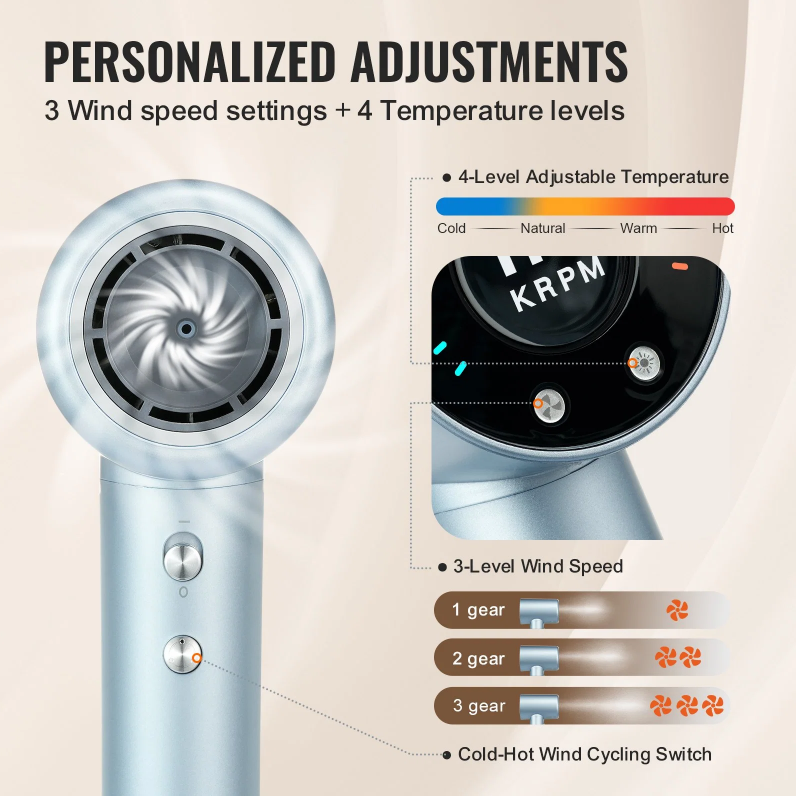 With 3 airflow speeds (low/medium/high) and 4 heat levels (cool/natural/warm/hot), you have the flexibility to adjust according to your styling needs. Clear LCD temperature display and personalized airflow control make hair drying a breeze, offering you a personalized hair care experience.