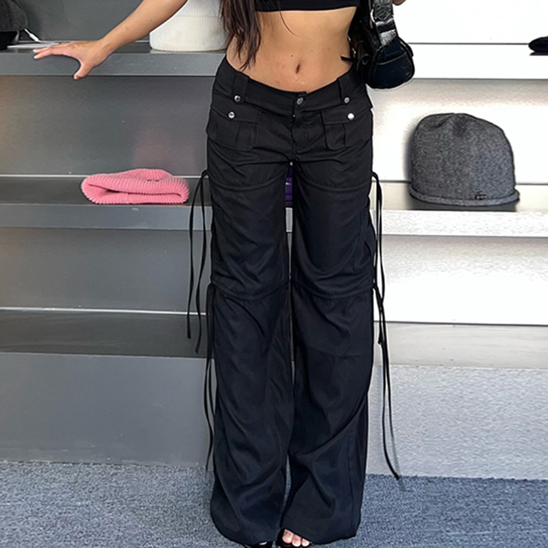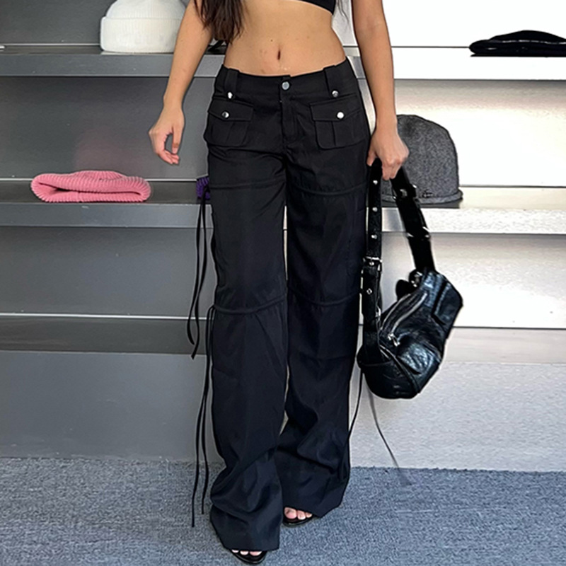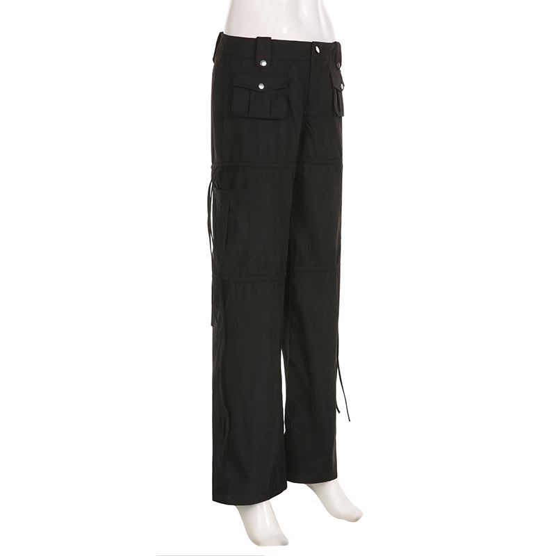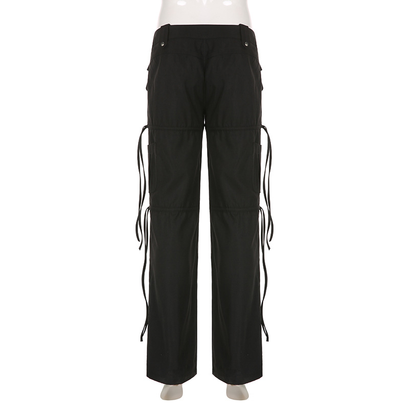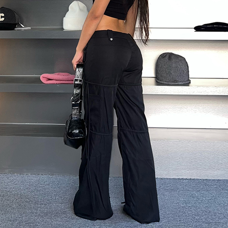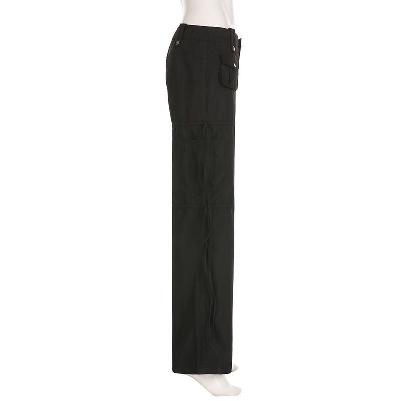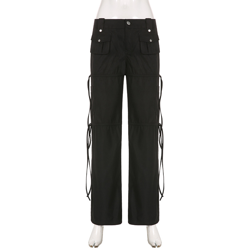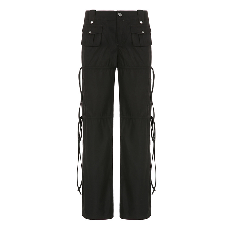 High Street Pocket Ribbon Stitching Straight Black Woven Pants
