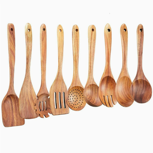 3. Ergonomic design: Each cookware is made of a solid teak wood without cracks. Ergonomic handle for easy operation and better reach. The hole at the end of the handle is used for hanging. The 6.3 -13.4 inches long tool can be easily put into large mixing bowls and soup pots!