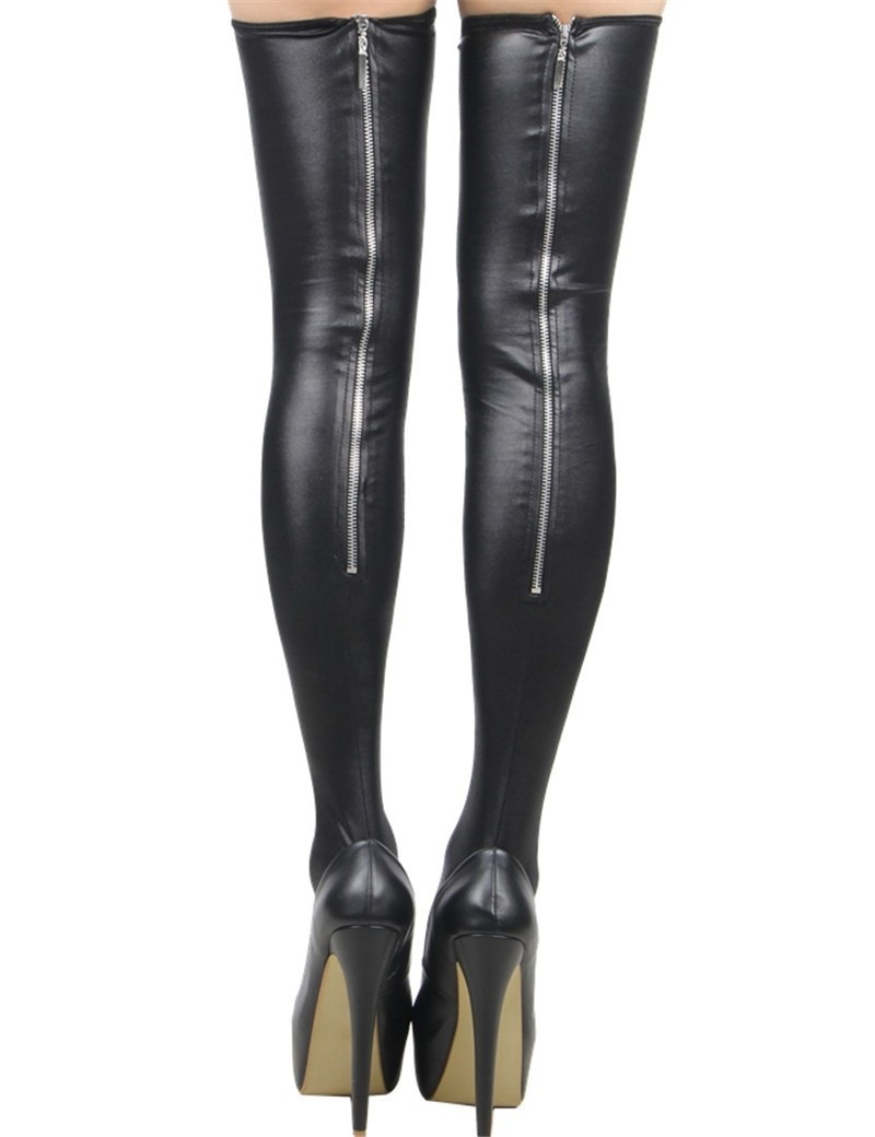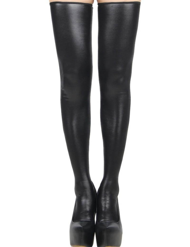 Description:Women Sexy Patent Leather Stockings Stretchy Non-slip Long Knee Socks Thongs Set