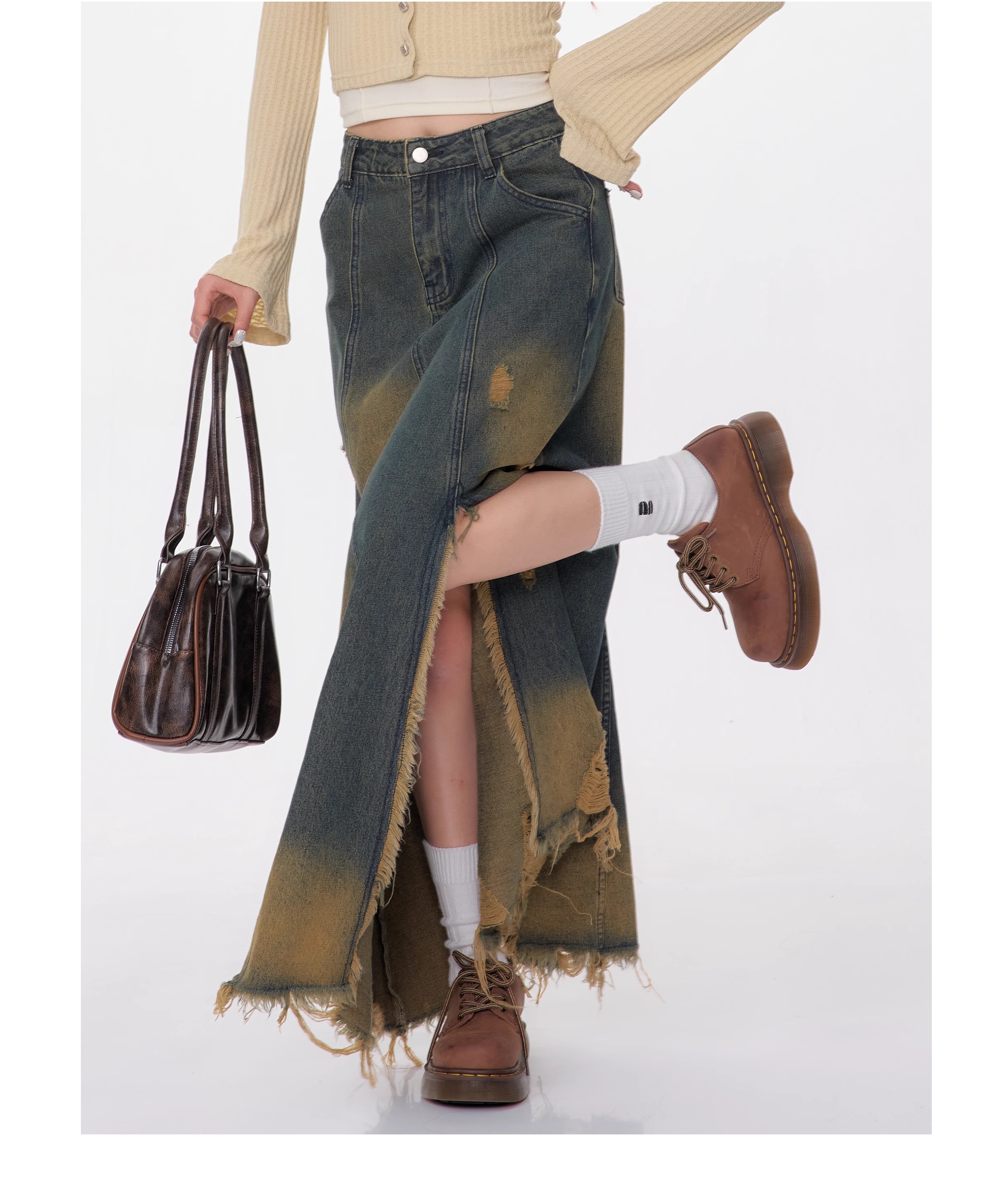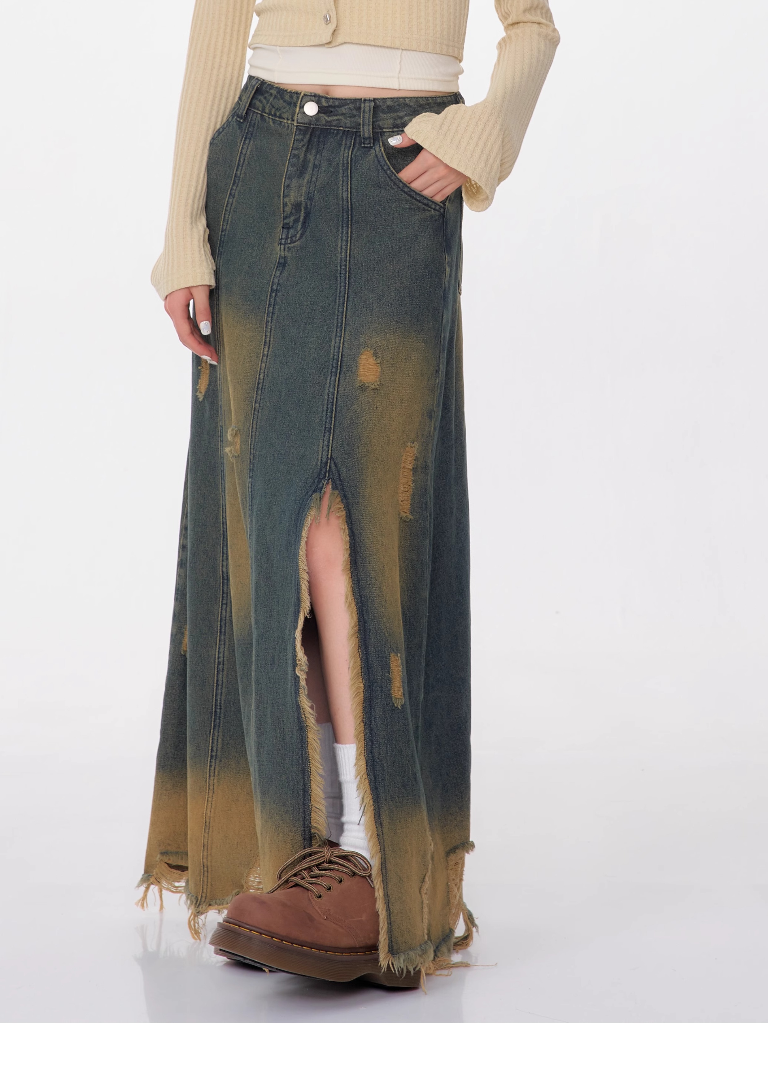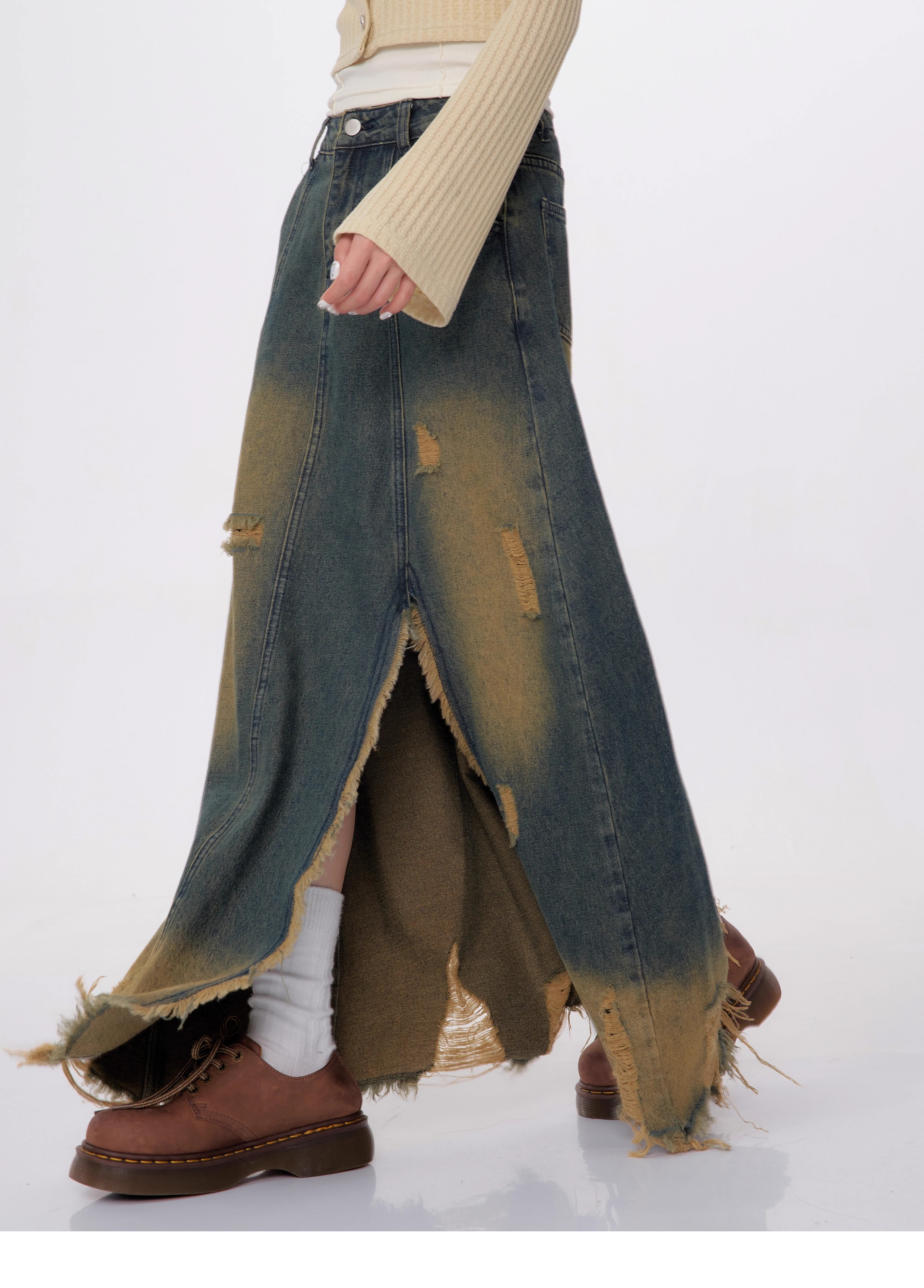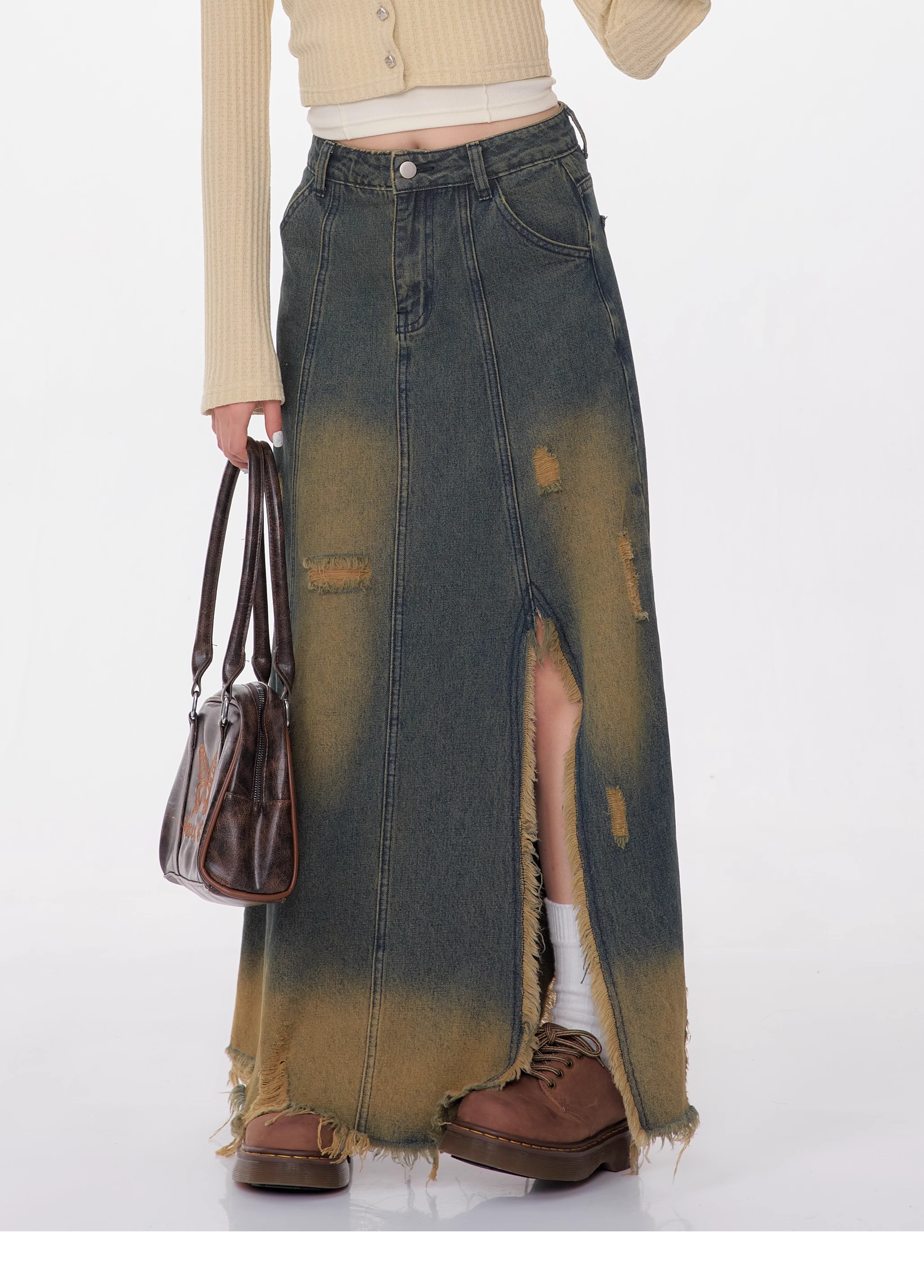 High Waist Mid-length Make Old Ripped Split Denim Skirt