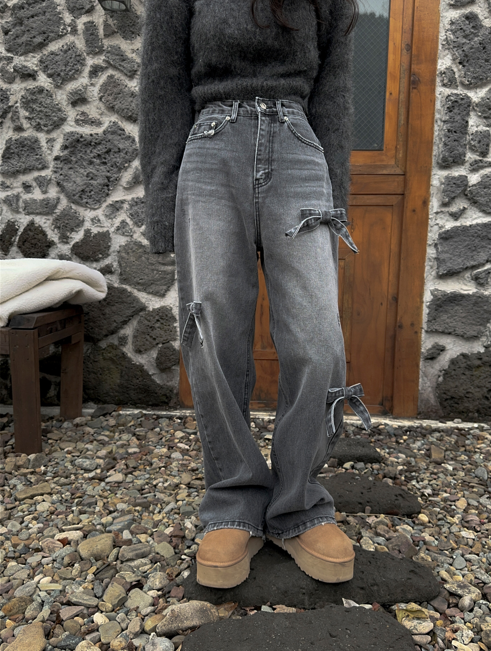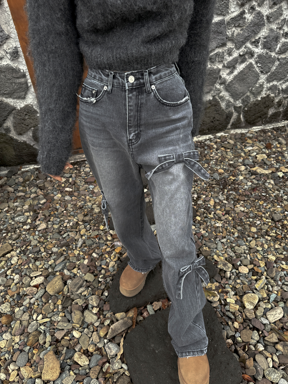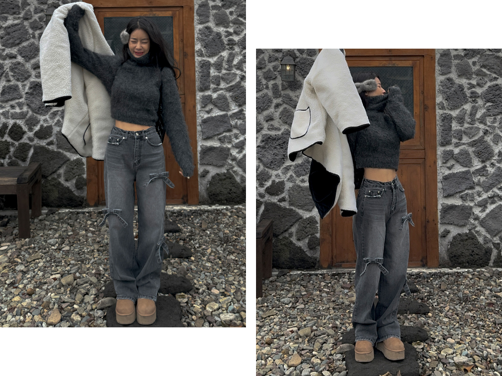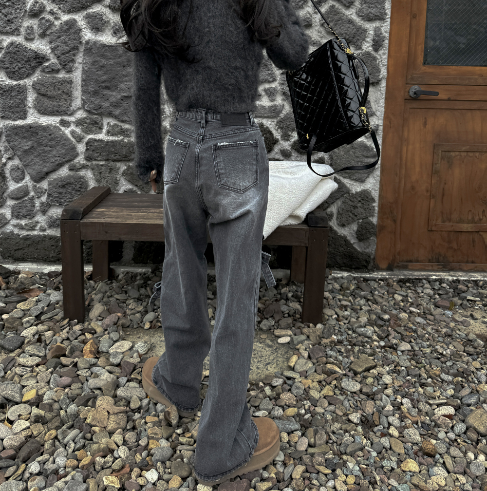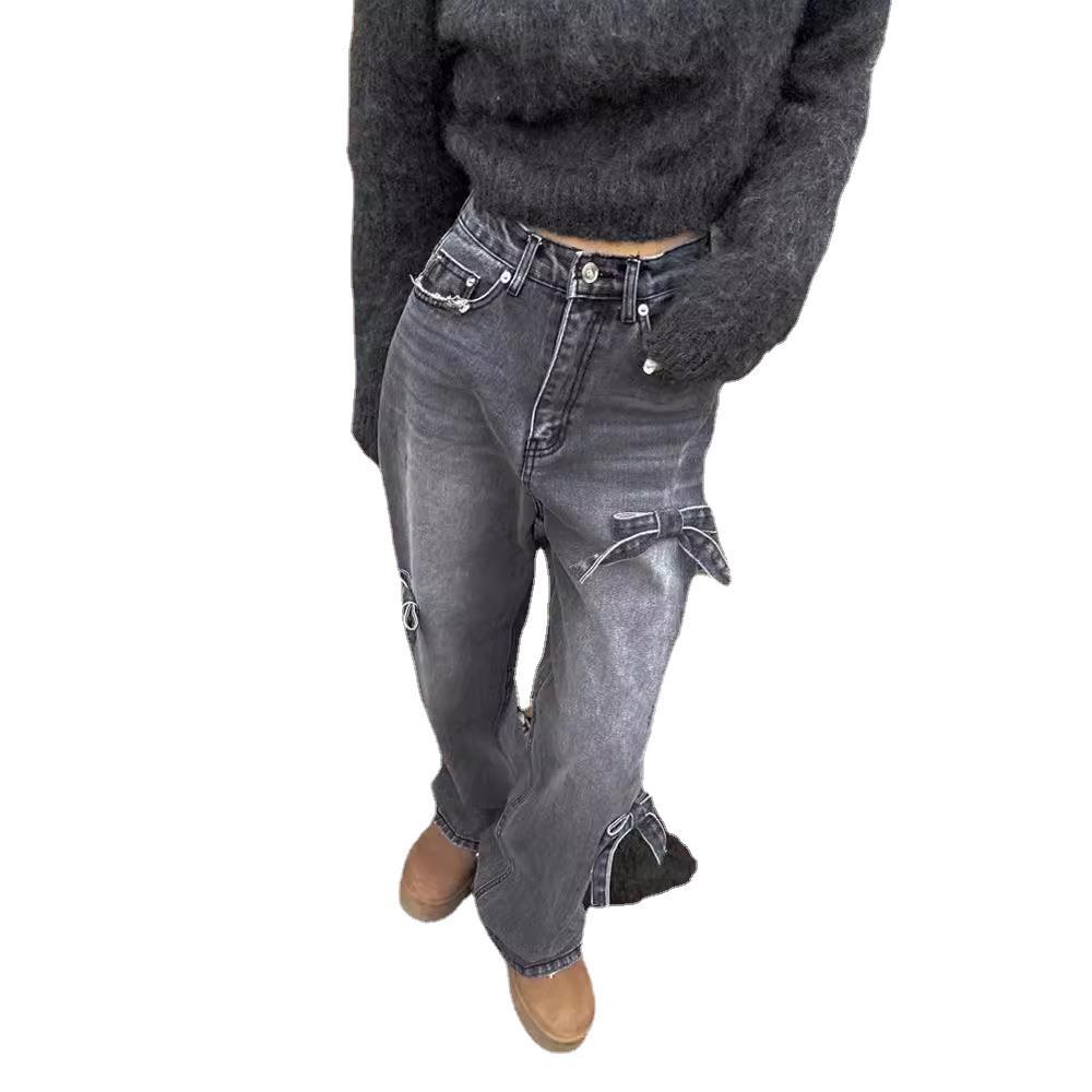 High Waist Slimming Casual Straight-leg Bow Washed Jeans Women's Pants