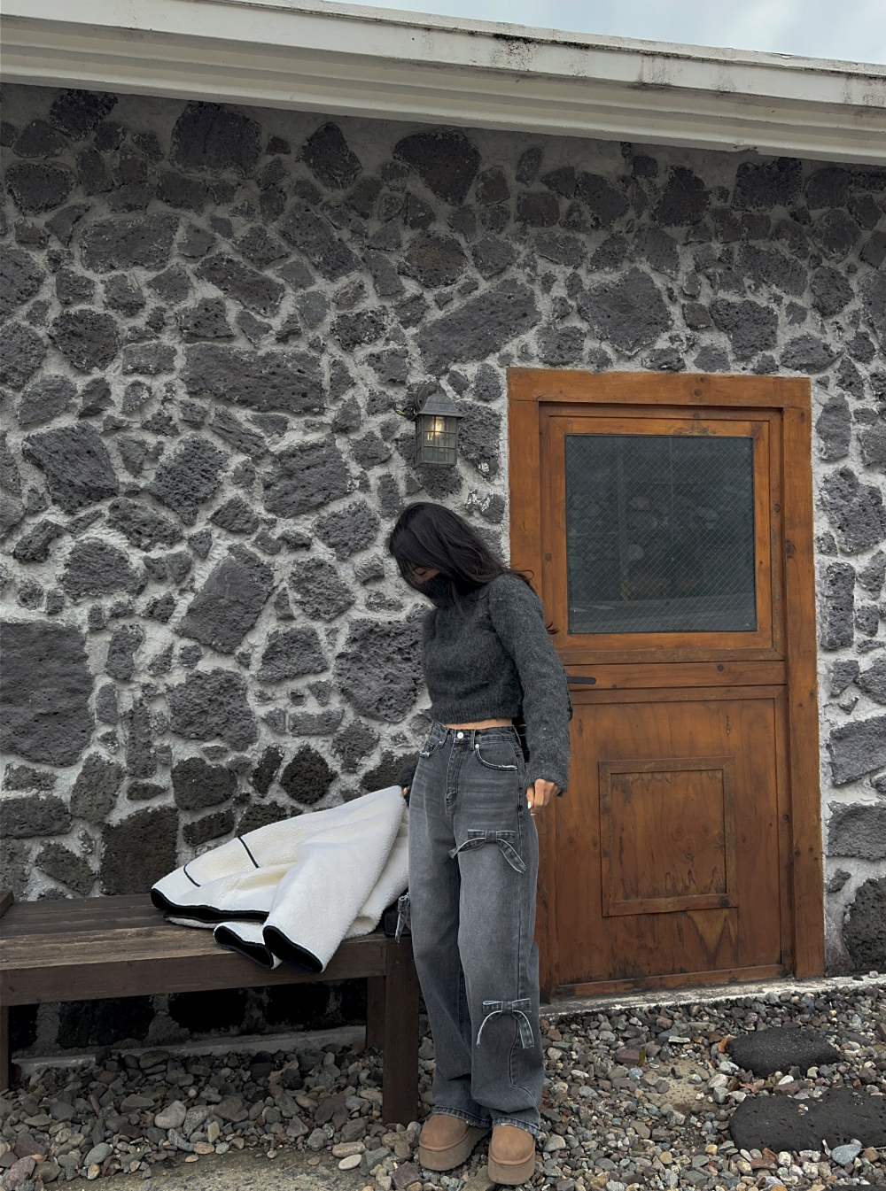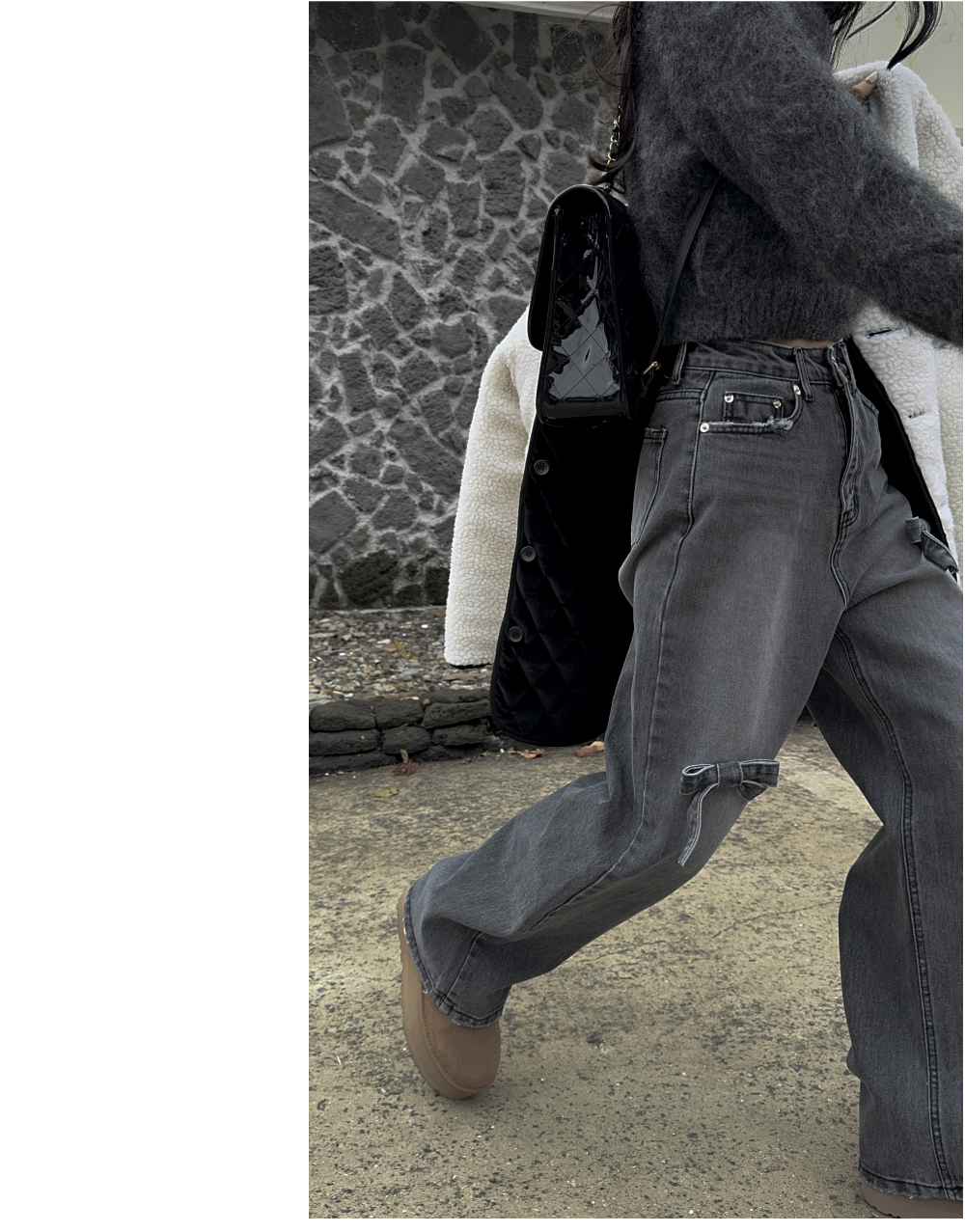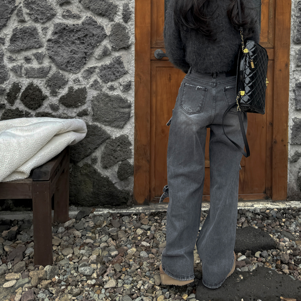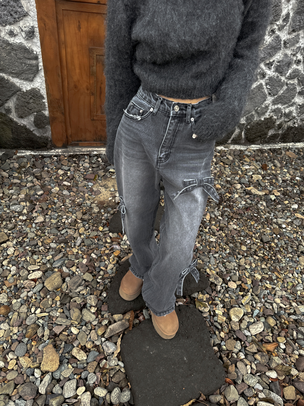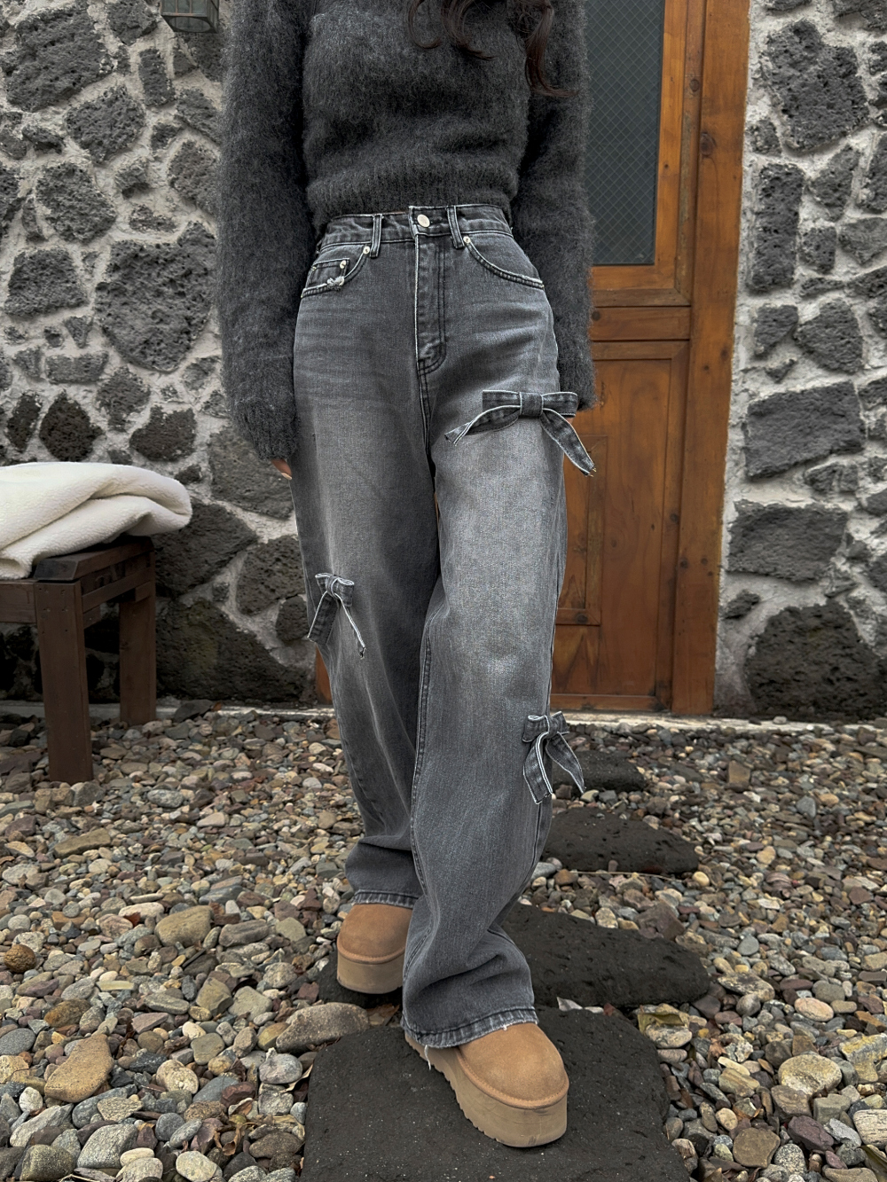 High Waist Slimming Casual Straight-leg Bow Washed Jeans Women's Pants