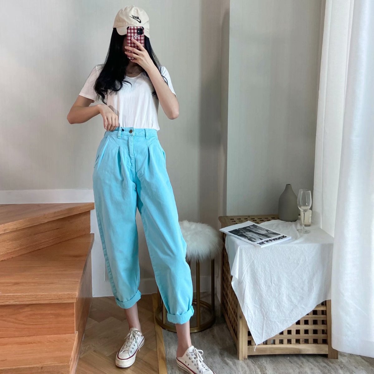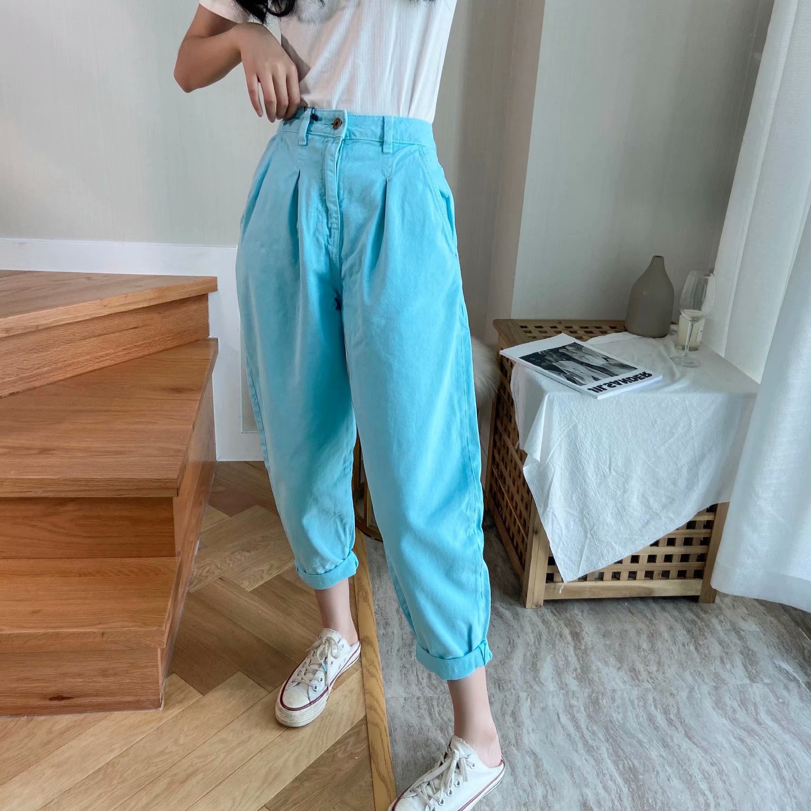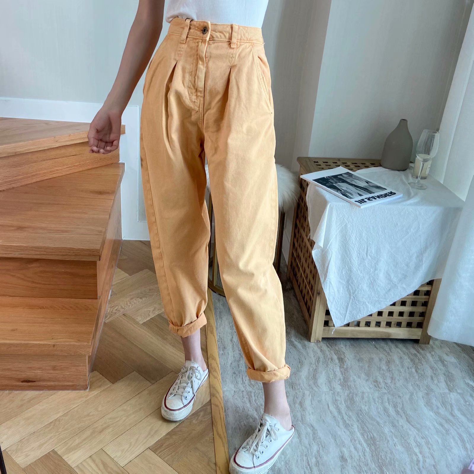 High Waist Washed Pleated Jeans Roll-up Radish Pants