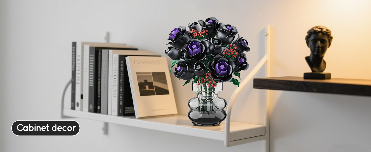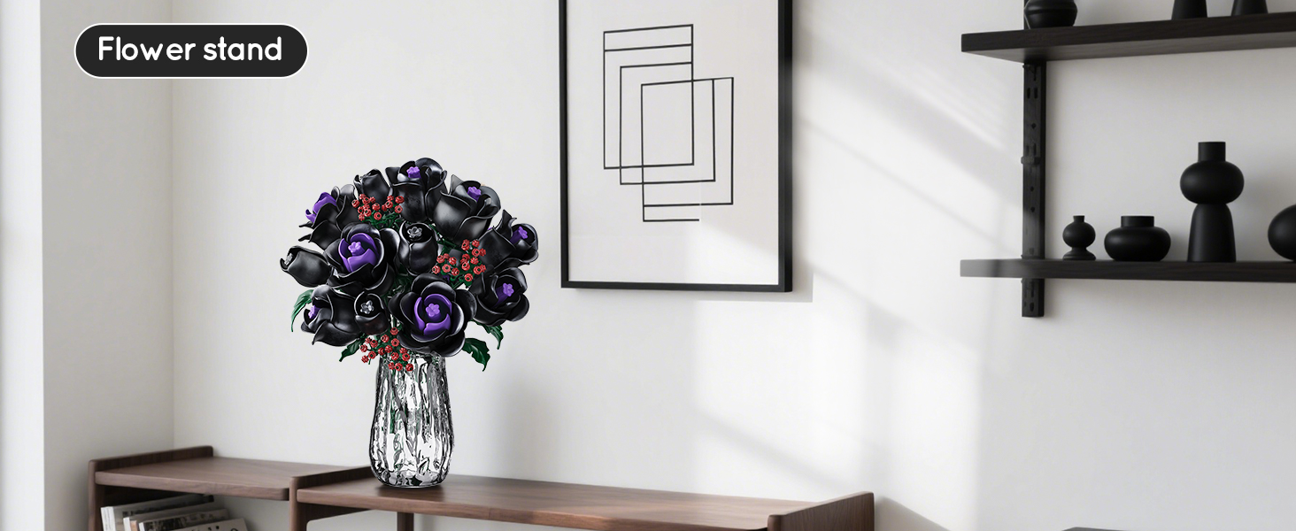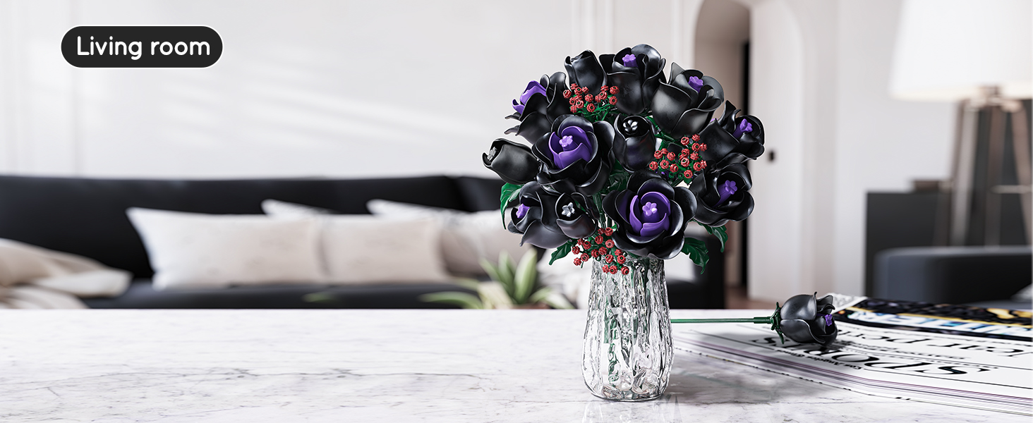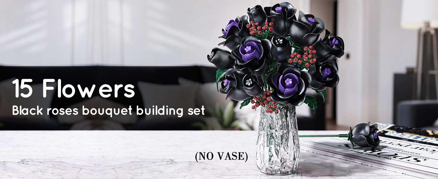 15 MYSTERIOUS BLACK ROSES-NO VASE: This black rose bouquet building set shows the elegance and nobility of black roses with mysterious black petals. A few purple petals are dotted in the center of the flower like jewels, adding a mysterious and charming color to this plant building kit. As you piece together layer by layer, the petals gradually bloom, as if a sleeping black rose is awakened by you, allowing to discover the beauty of nature! (DOES NOT INCLUDE VASE)