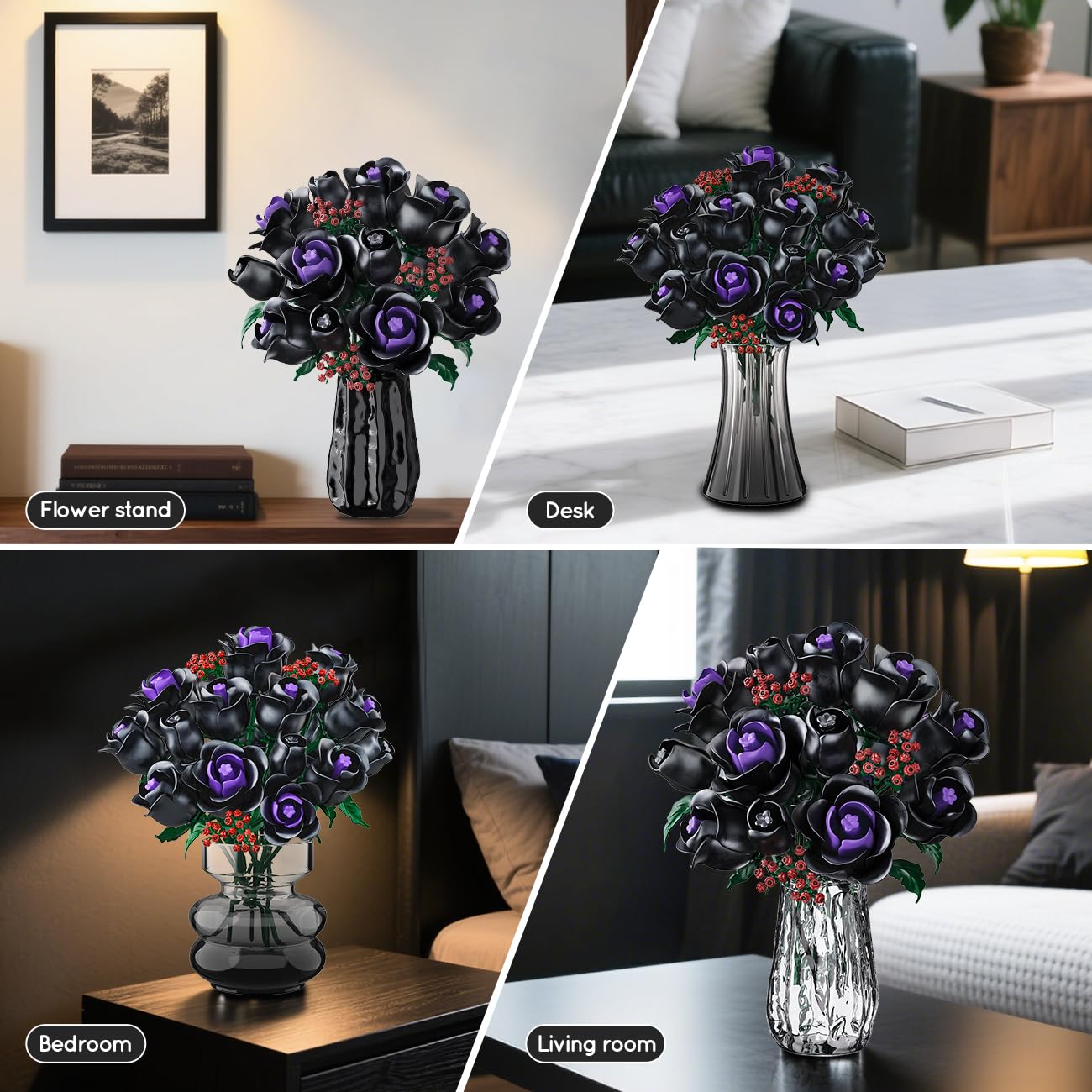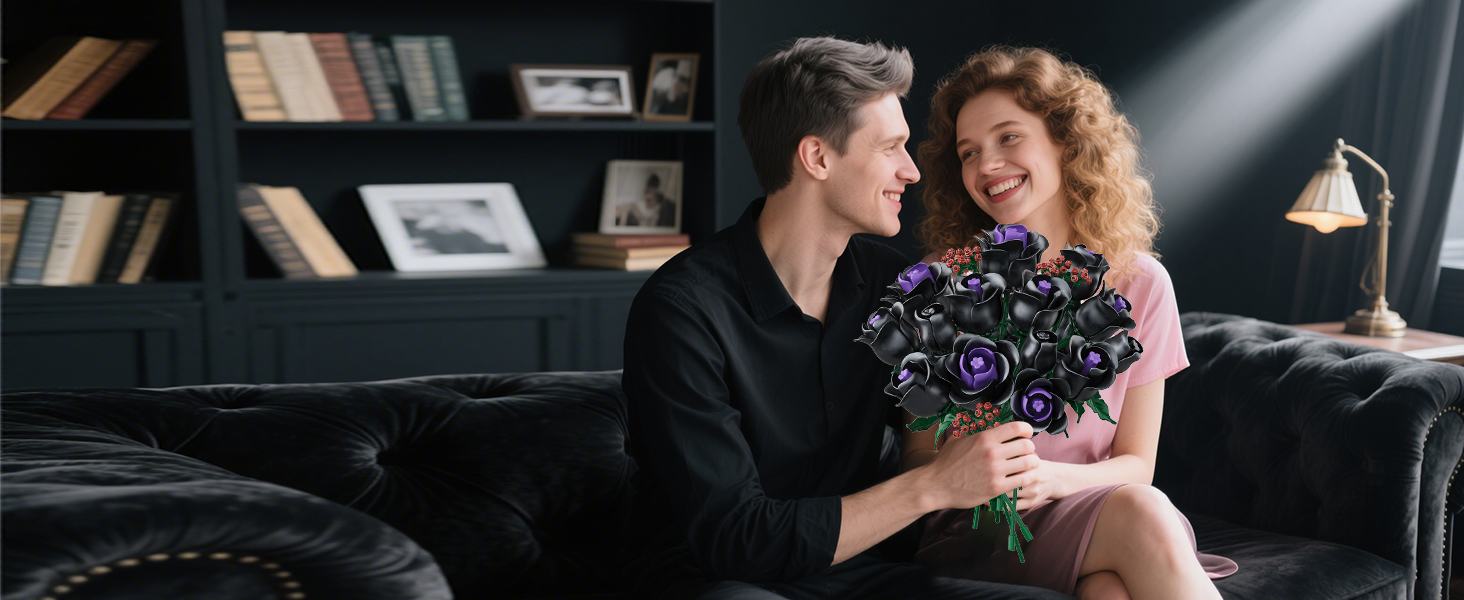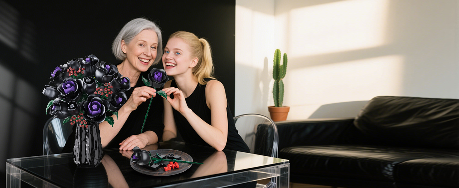 15 MYSTERIOUS BLACK ROSES-NO VASE: This black rose bouquet building set shows the elegance and nobility of black roses with mysterious black petals. A few purple petals are dotted in the center of the flower like jewels, adding a mysterious and charming color to this plant building kit. As you piece together layer by layer, the petals gradually bloom, as if a sleeping black rose is awakened by you, allowing to discover the beauty of nature! (DOES NOT INCLUDE VASE)